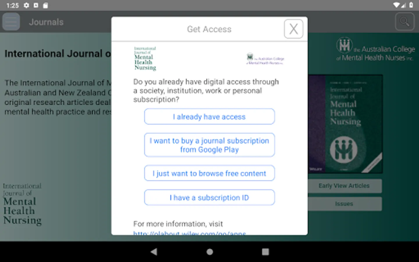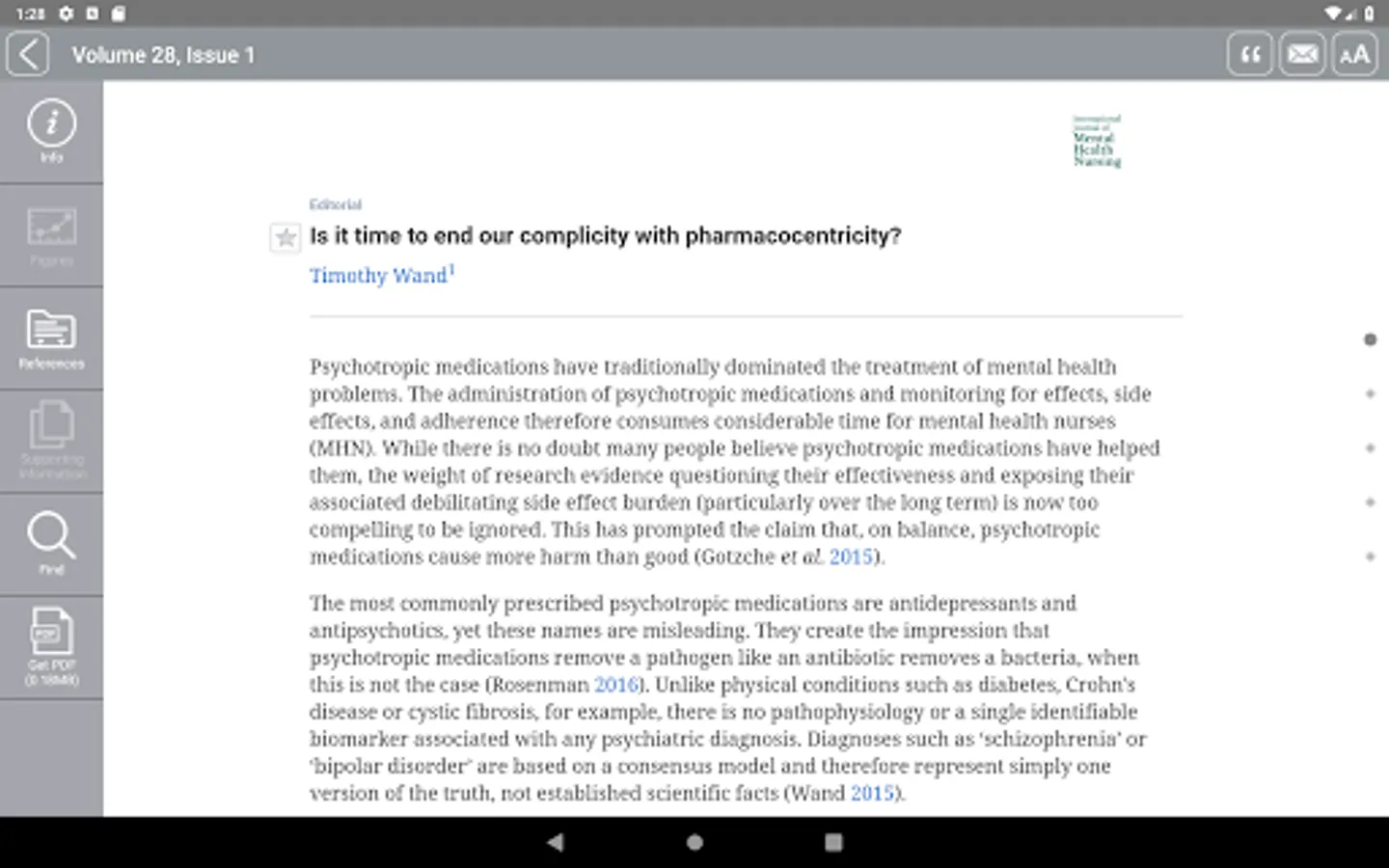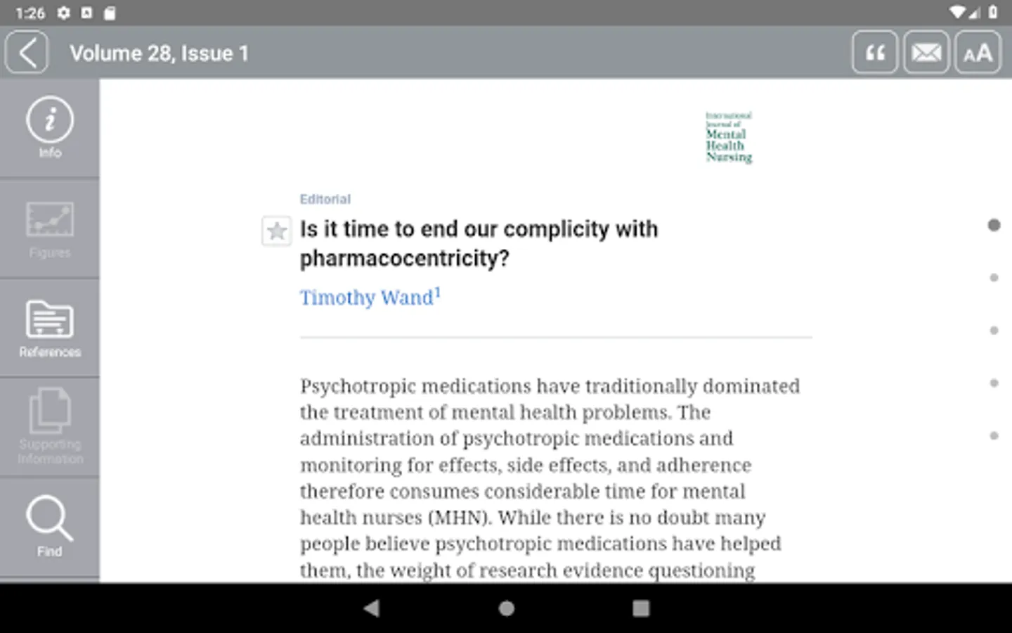 This is the app for the International Journal of Mental Health Nursing, a fully refereed journal examining current trends and developments in mental health practice and research. The Journal provides a lively forum for the exchange of ideas on all issues relevant to mental health nursing, including directions in education and training, management approaches, policy, ethical questions, theoretical inquiry and clinical concerns.