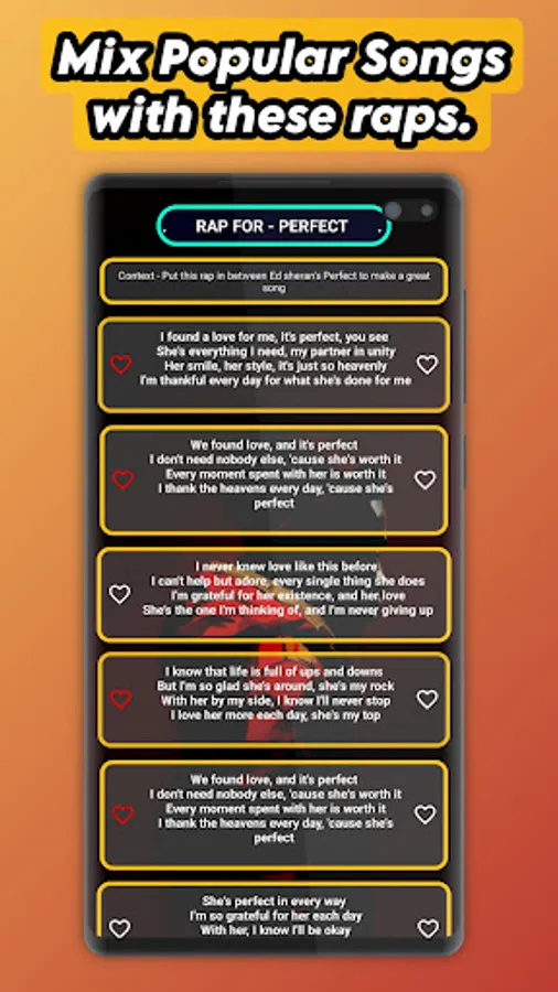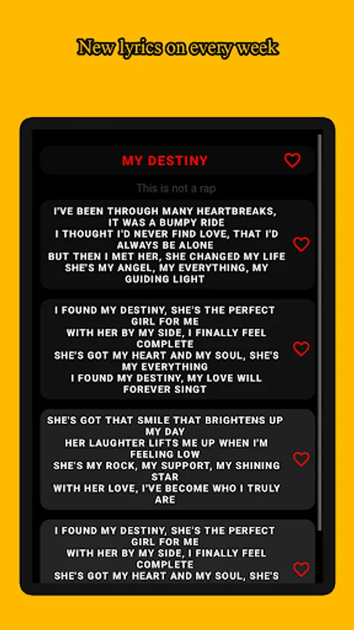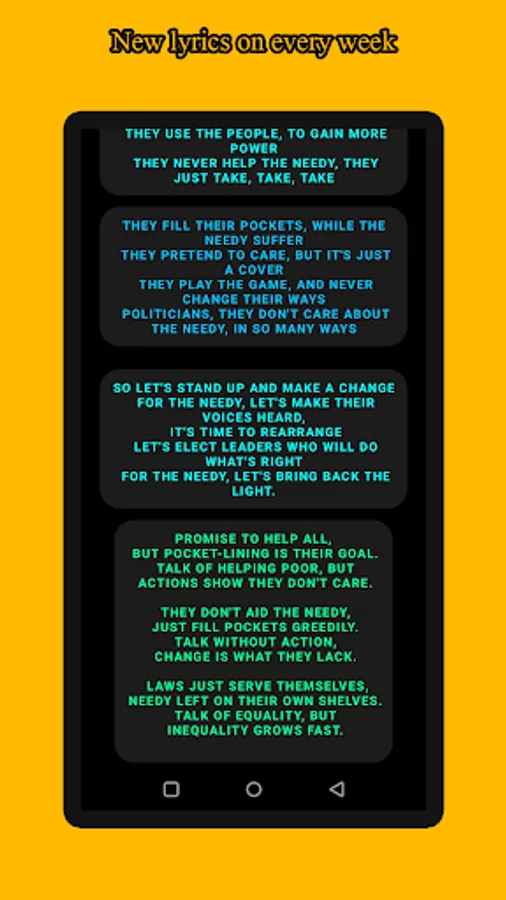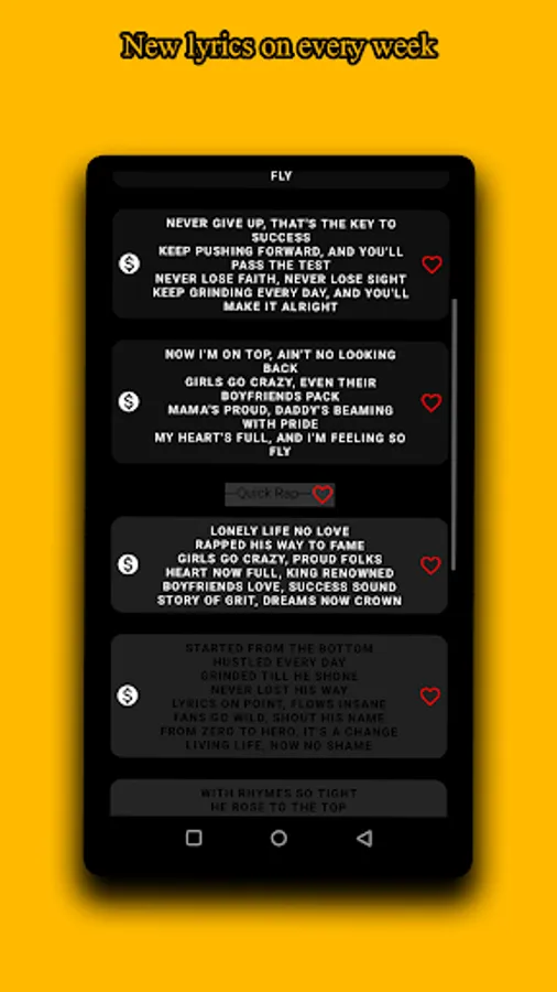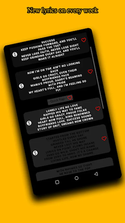 Introducing Rap Lyrics - the ultimate app for all aspiring rappers and hip-hop enthusiasts! Are you struggling to write your own rap songs? No problem! With Rap Lyrics, you now have access to newly written songs by the talented Shivam Das, added every week!
