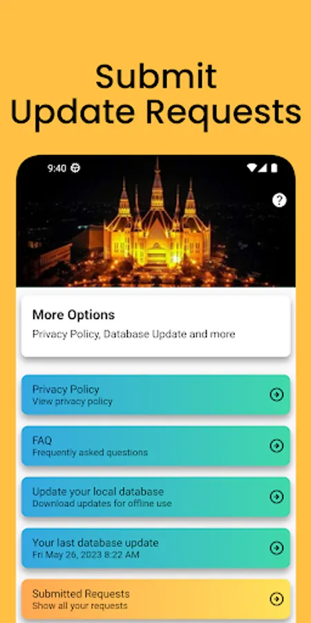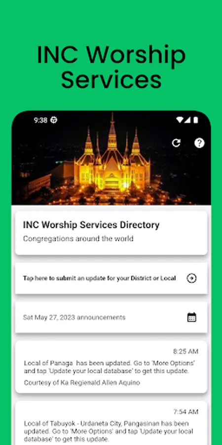 This app has a local copy of INC's worship schedule around the world, meaning no internet is needed to check for congregations (unless you want to get the updated schedules).