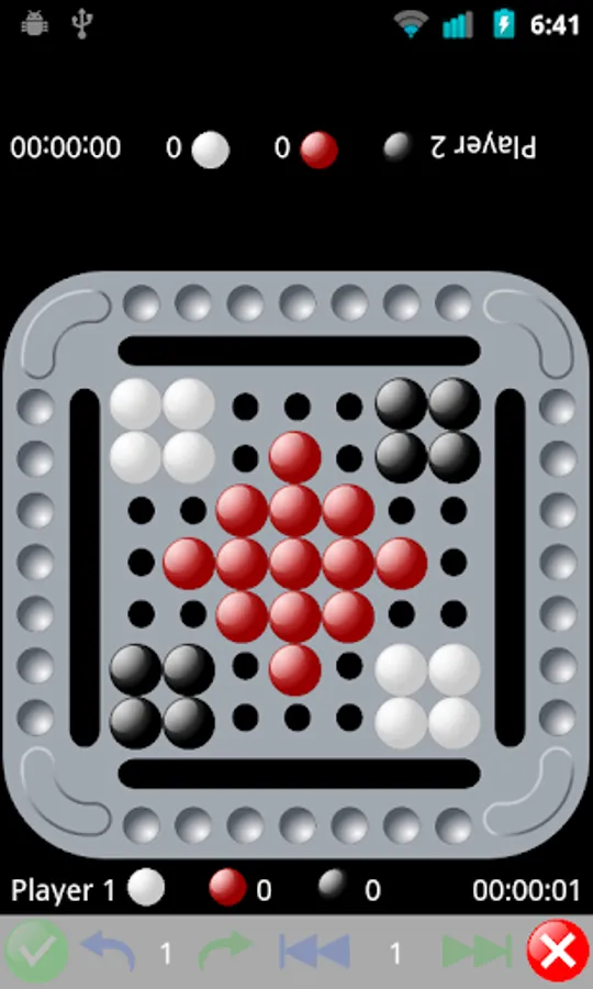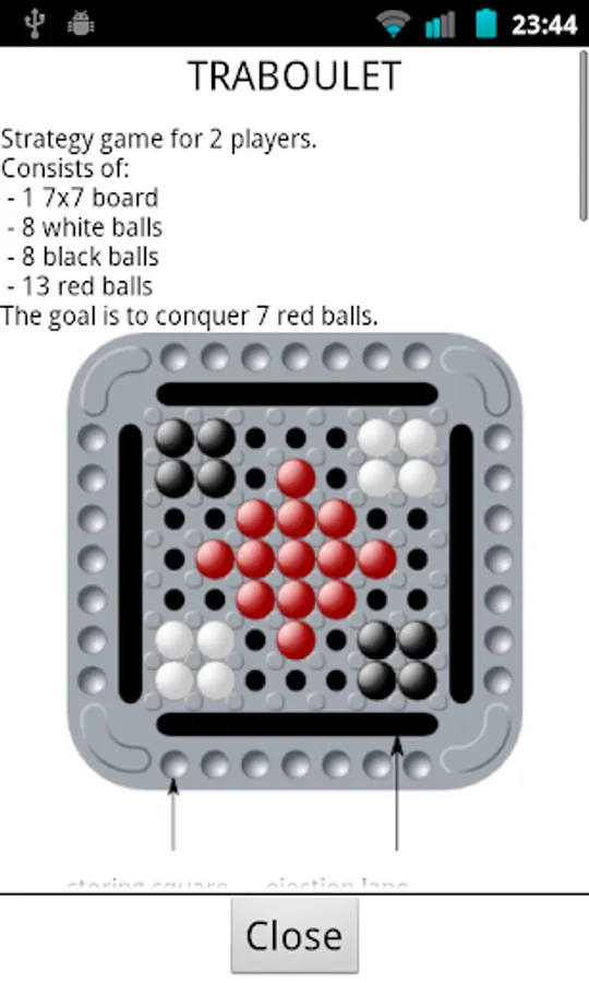 It consists of: one 7x7 board, 8 white balls, 8 black balls, 13 red balls