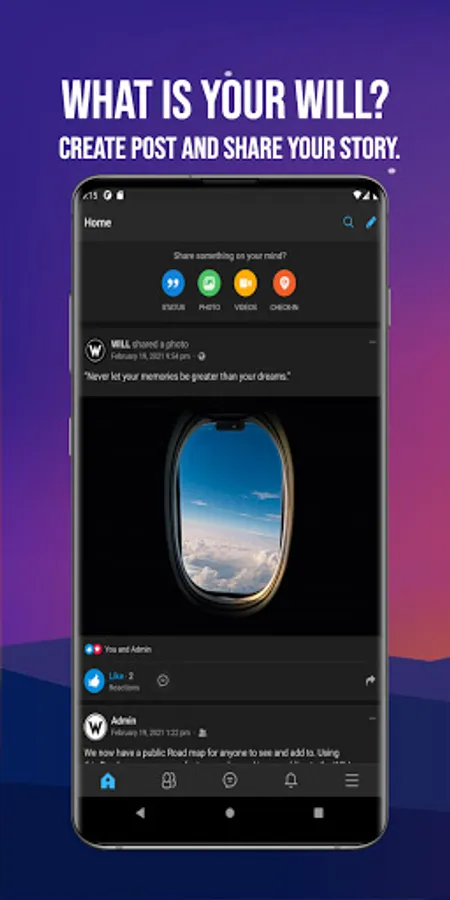 WHAT IS YOUR WILL? The WILL Platform is a social networking platform built to bring Individuals together that share common interests. Create posts, join groups, listen to music or podcast, watch or upload videos, and much much more!