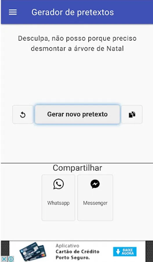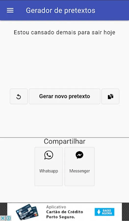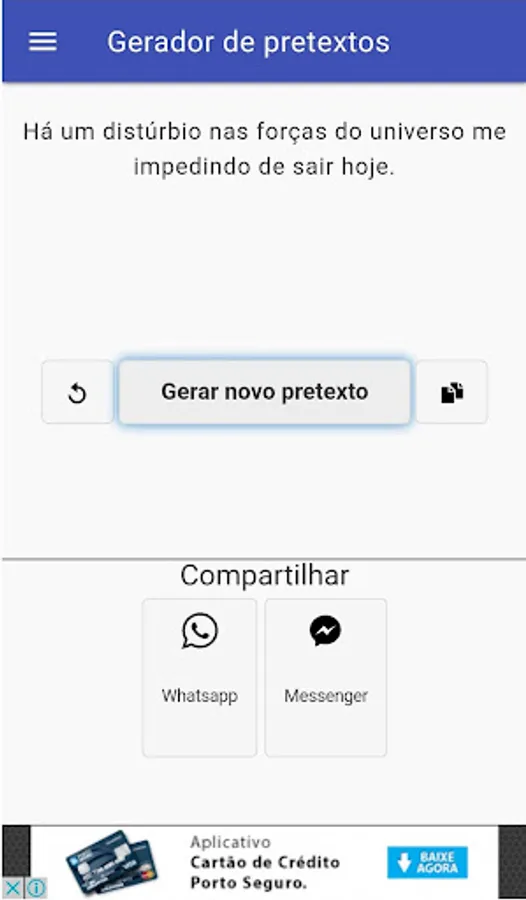 pretexts generator is the ideal application for those people who always has an excuse for everything time to leave or perform some activity out of your routine, with this application you can generate all kinds of excuses to stop doing what you do not want from washing dishes to fix the computer Grandma.