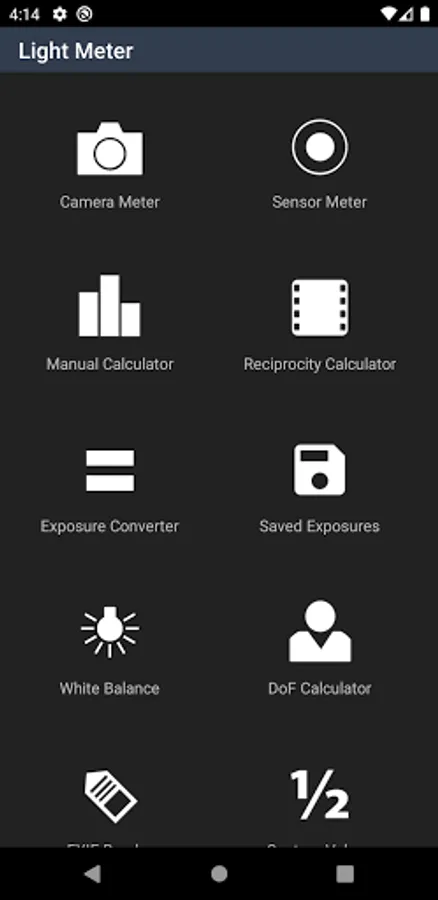 A reflected light meter with spot metering (using the device's camera) and an incident light meter (using the device's light sensor) in one app. Tested accurate against Gossen and Sekonic meters on most devices.