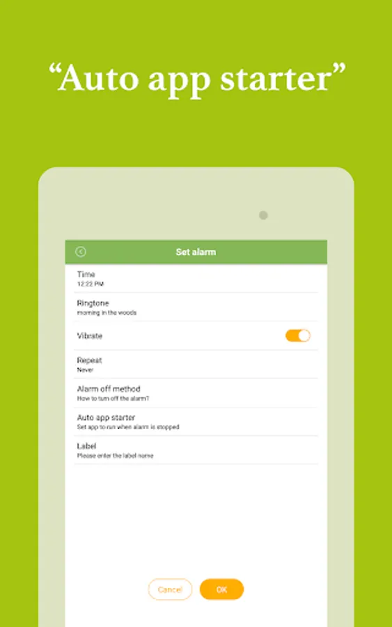 Method of alarm - Vibration, sound Auto starting other app that you reserved like ‘weather App’, ‘news App’, ‘stock App’, ‘clock App’ and etc When you turn this alarm off Naming each alarm ? when you set several time.