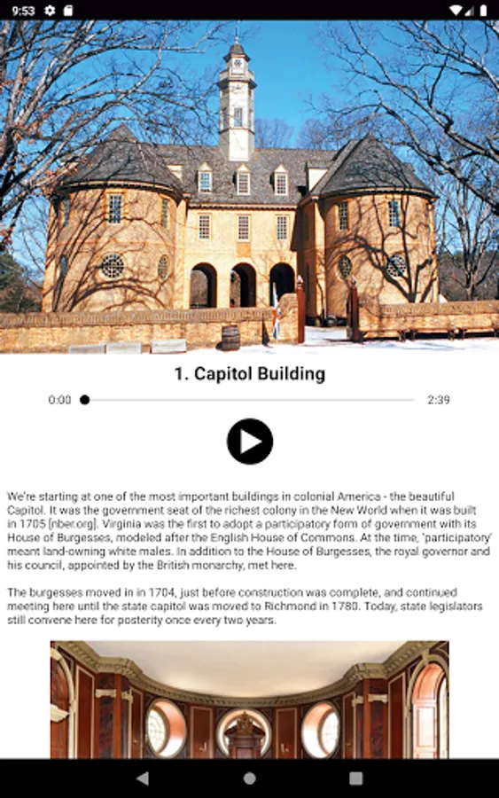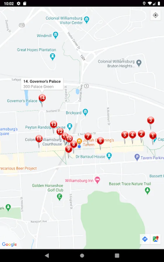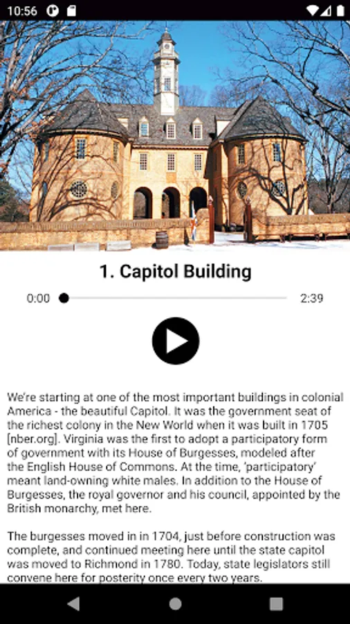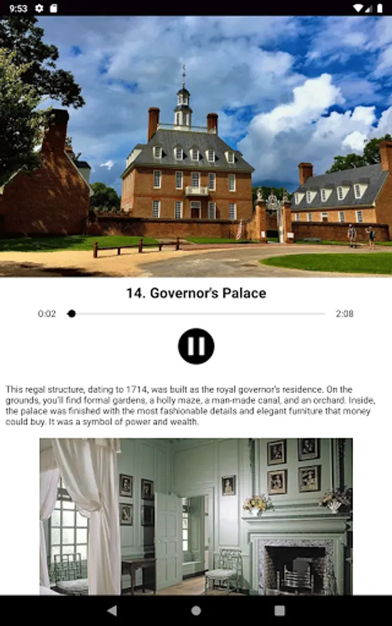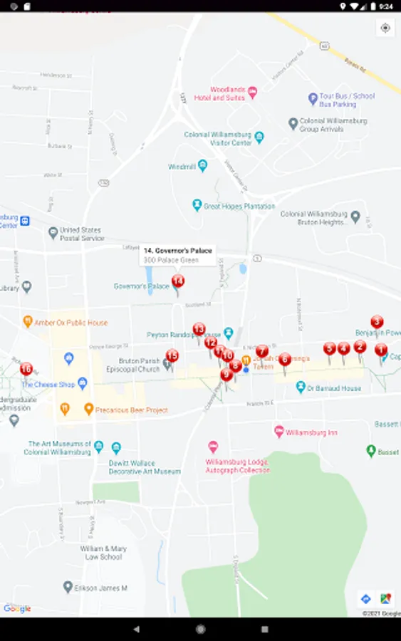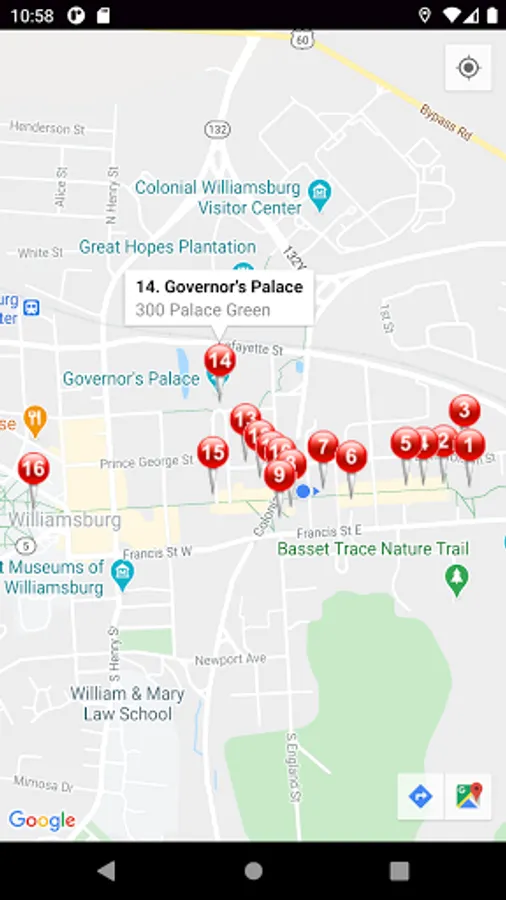 Williamsburg: gentile, gracious, and the heart of American history. The city has been continuously lived and worked in for well over three centuries now! Come see how our colonists worked and played, shopped and celebrated, raised their kids and punished rule-breakers. This tour is about 1.5 miles long and stops at 16 historical sites.
