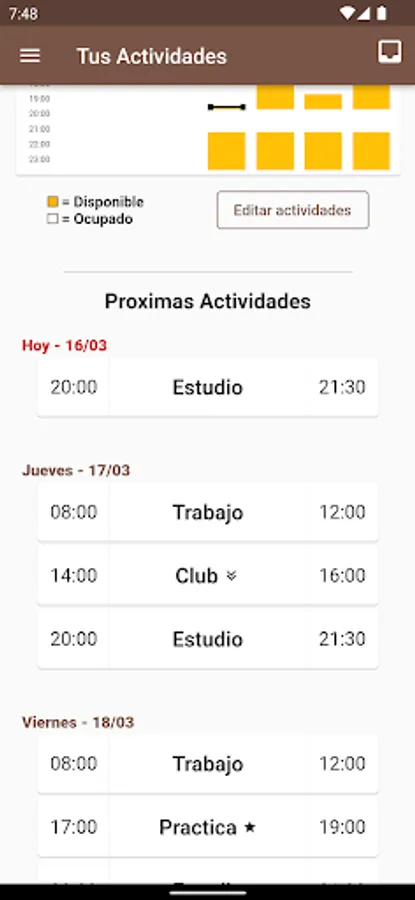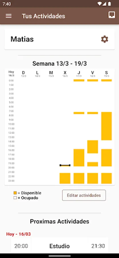Schedule activities with your acquaintances through "Agendemos". You can use "Agendemos" as your own virtual agenda, keeping track of your weekly activities, to later integrate groups and easily obtain the group agenda and its time availability.