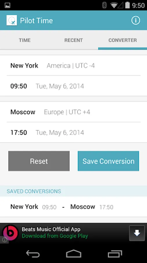The "Saved Conversions" widget allows the user to quickly access all of their saved time zone conversions.