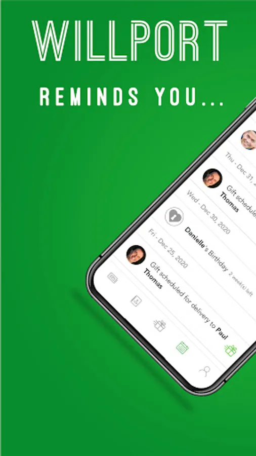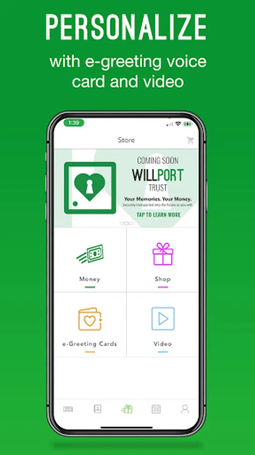 The WILLPORT App is multiple apps in one. Create a WILLPORT circle of family and friends. WILLPORT will allow you to send money payments and over 250 trackable electronic gift cards, flowers, and experiences like Kayaking or Golf. Be notified of special events, like anniversaries and birthdays. The App will deliver immediate or scheduled transmissions of money and gifts and track them on a calendar and newsfeed. Attach free personalized voice electronic greeting cards created from your photos or a featured artist. Users can schedule one time or recurring payments of money with personal voice or video messages. You can also send gifts to non-Willport users. Even say "thank you" after receiving money and gifts.