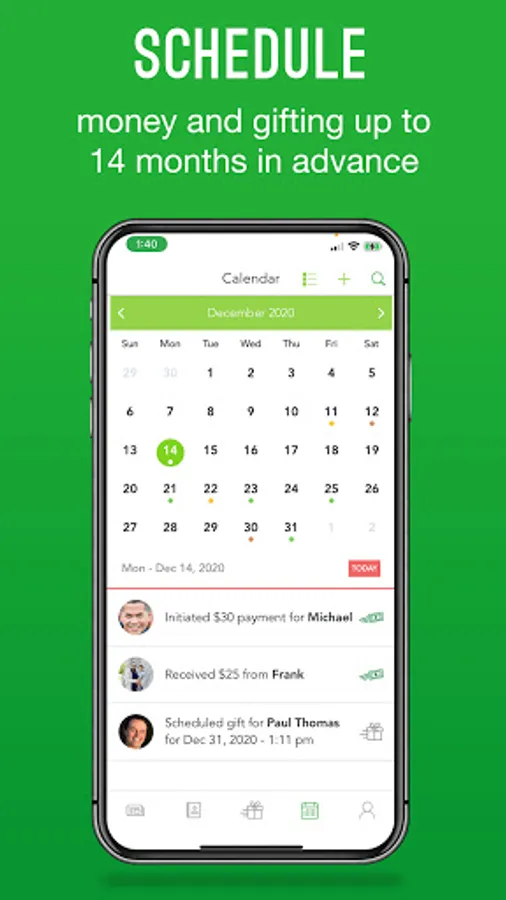 ADVANCED SCHEDULING: In one day, schedule up to 14 months of money and gifting. When that important occasion arrives, money, scheduled greeting cards, videos, and gifts will be delivered to the designated recipient on time, every time.