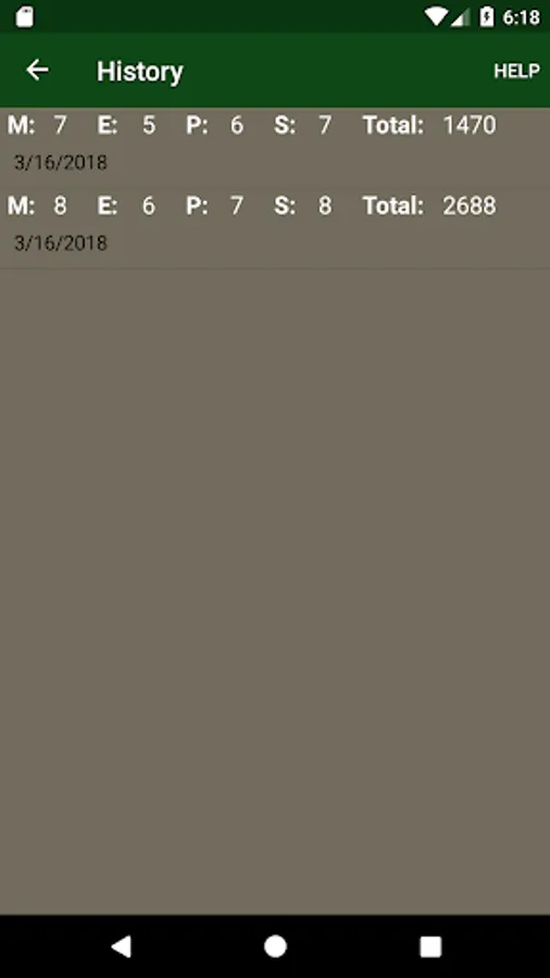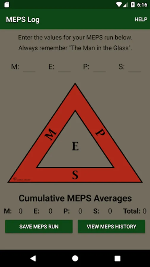 This application automates this process for you, and keeps track of every MEPS run that you record. A lifetime average is kept and displayed on the home page to give you a sense of where you are now, and how you can improve. Strive for self improvement, and strive for balance.