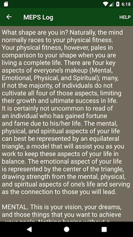 Similar to a 10k run, a MEPS run pushes you to strive for the ultimate goal of 10,000. Rate the mental, emotional, physical, and spiritual aspects of your life on a scale of 0 to 10. When they are multiplied together, you will get a number between 0 and 10,000. This number is the result of your MEPS run. Use this number as a motivator for self improvement and self introspection. What are your strengths? What are your weaknesses? Which side of your MEPS run bring your total up? Which bring it down? If you are honest with yourself, MEPS can be a powerful tool to inspire action, and to jump start you on the journey to complete your goals.