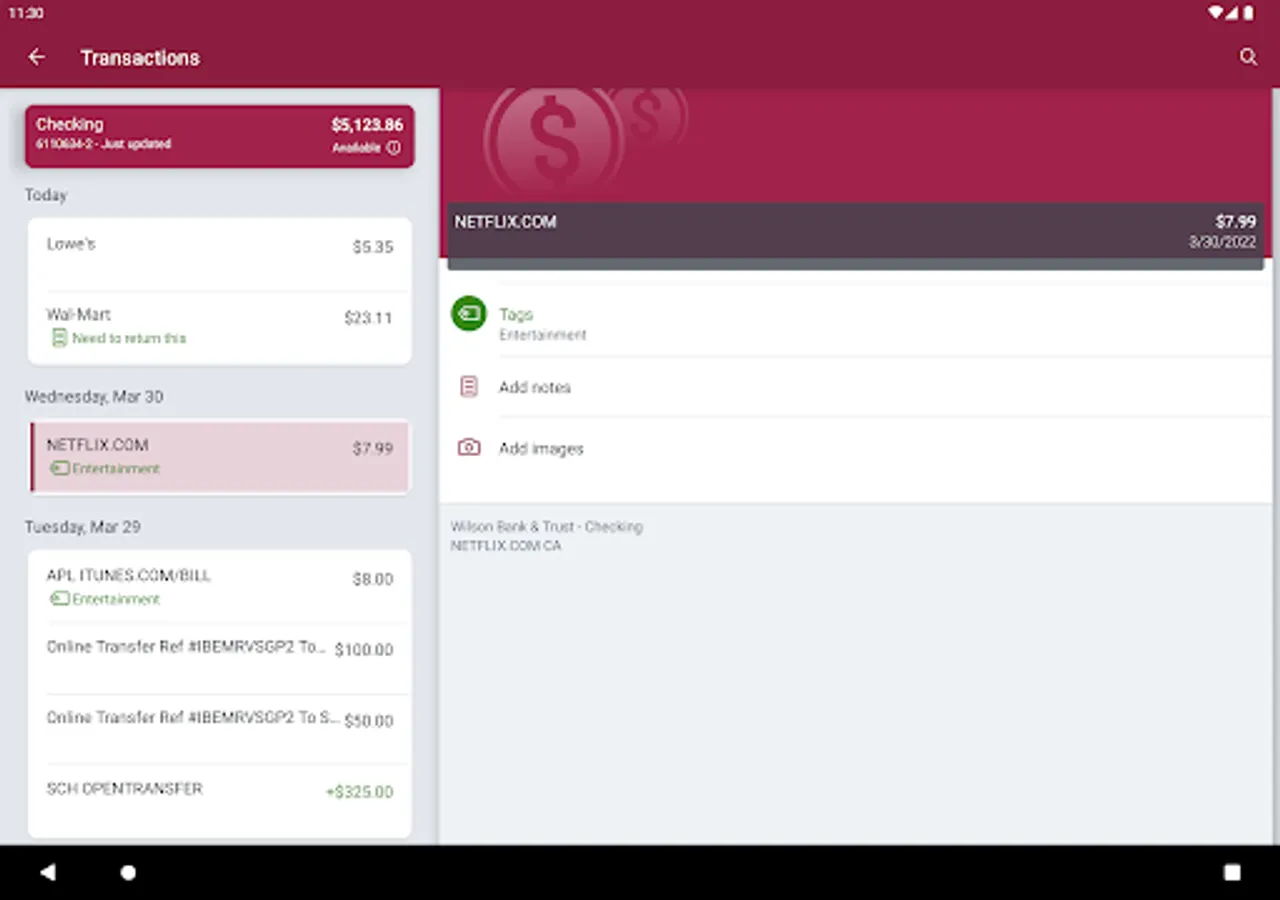 Add Tags, Notes, Images & Geo-Information: By enhancing transactions with custom tags, notes or photos of a receipt or check, you have the ability to stay organized and find exactly what you’re looking for when searching through your finances.