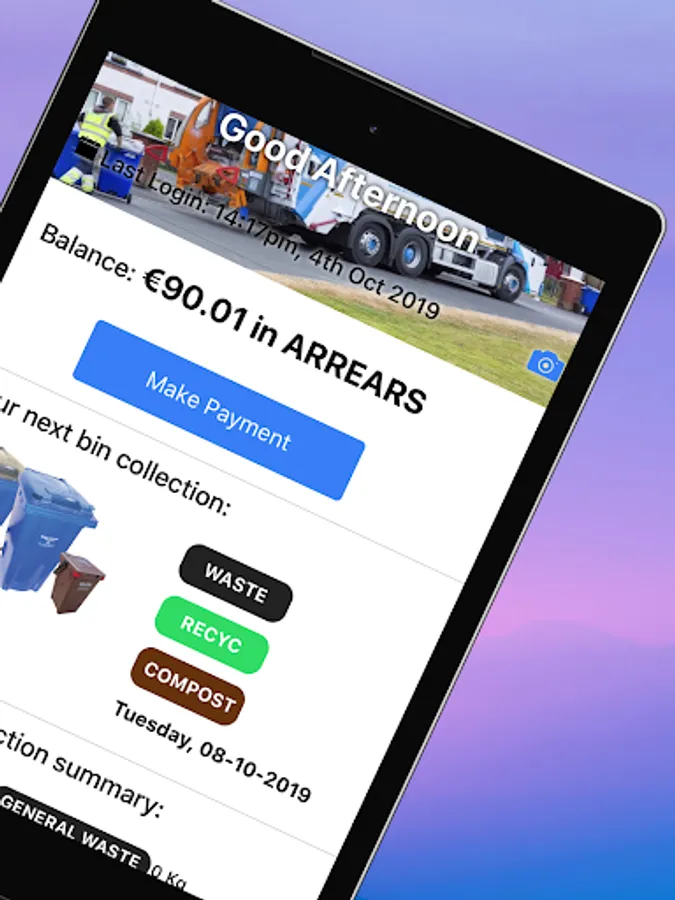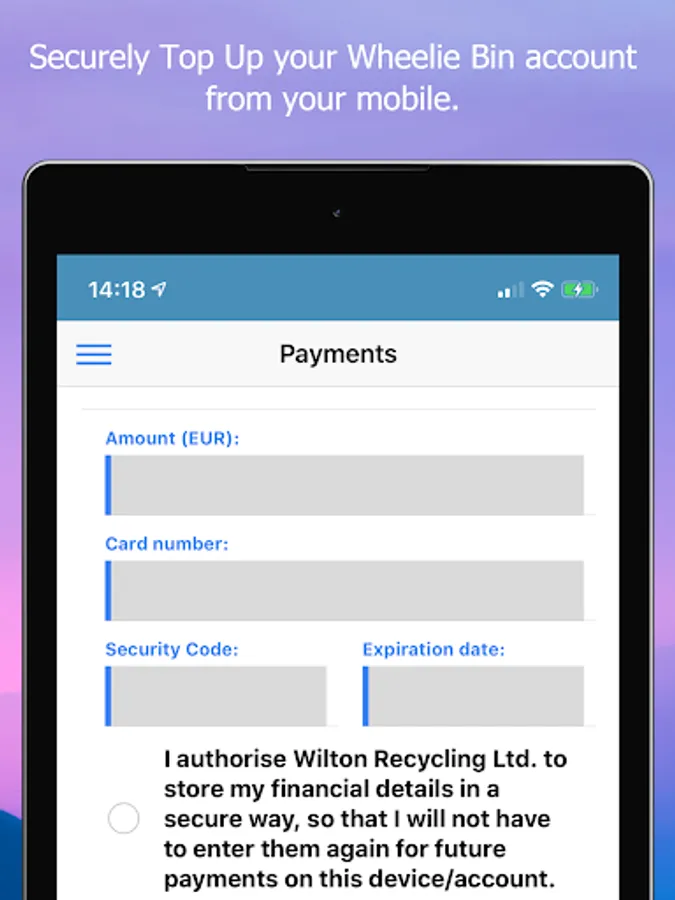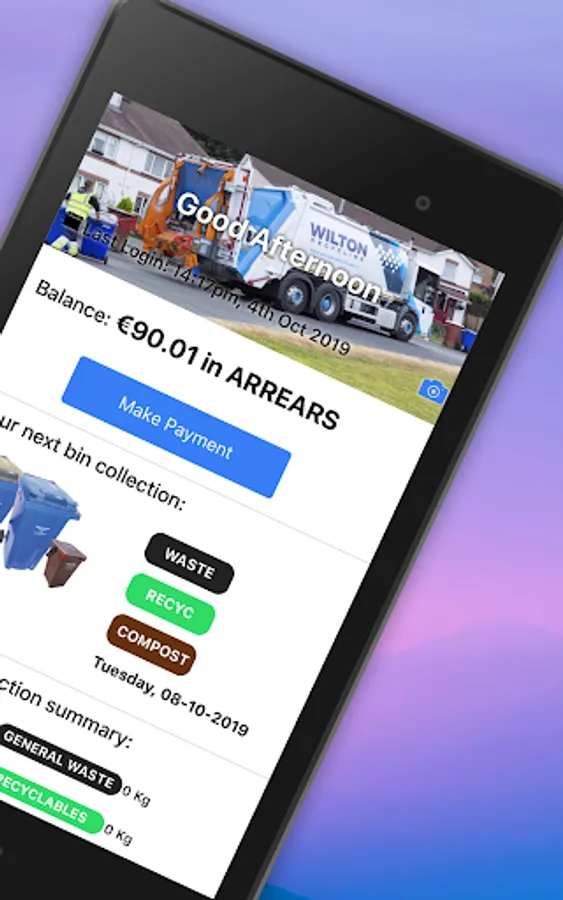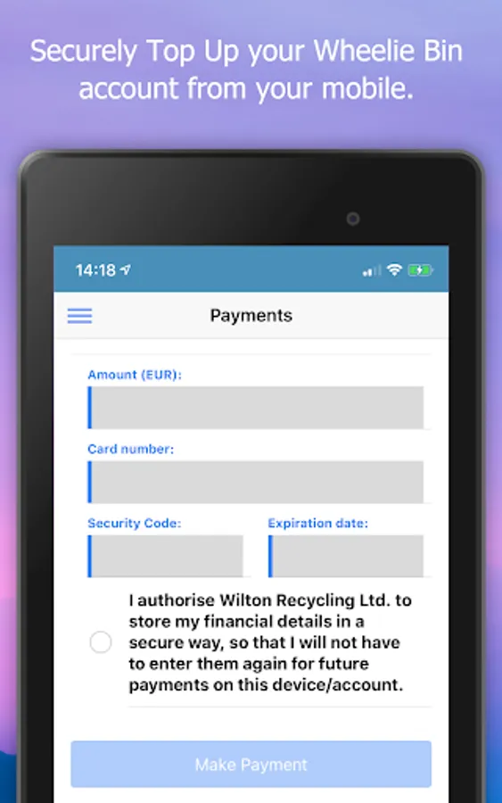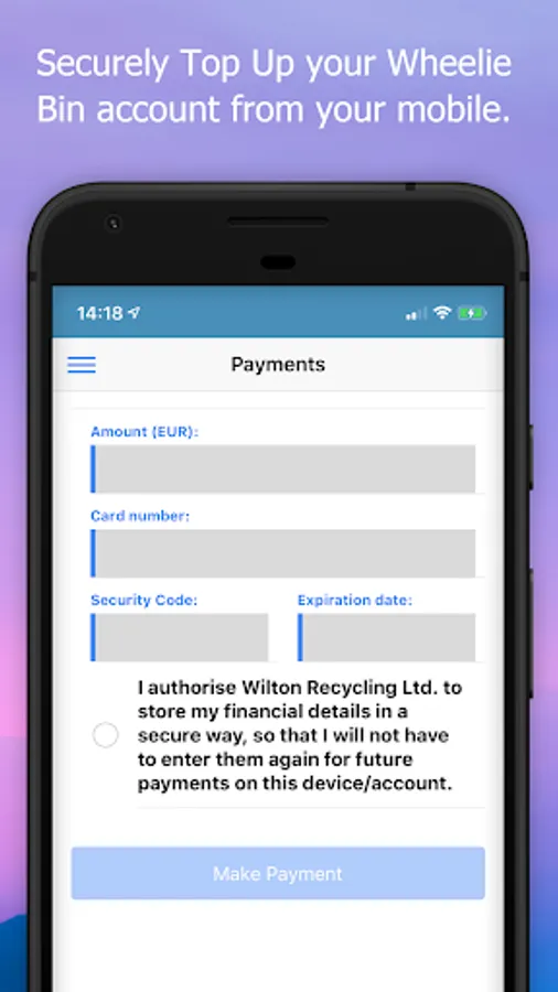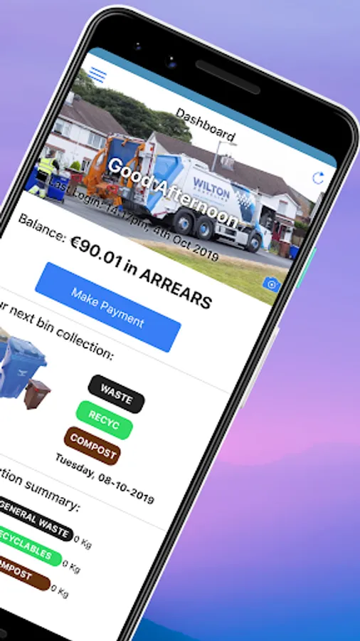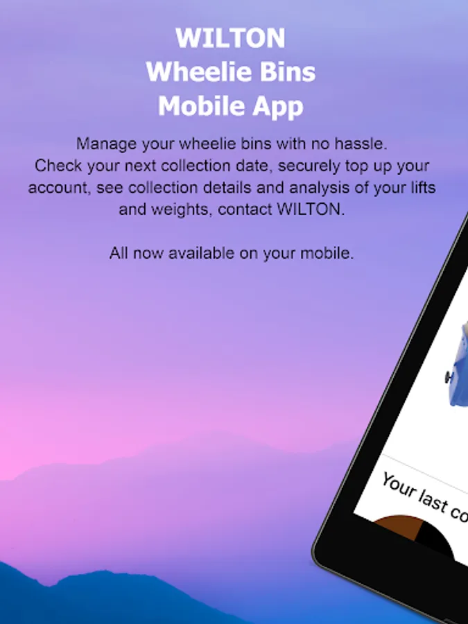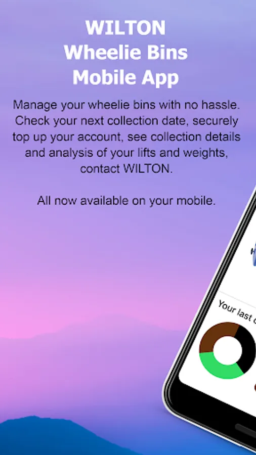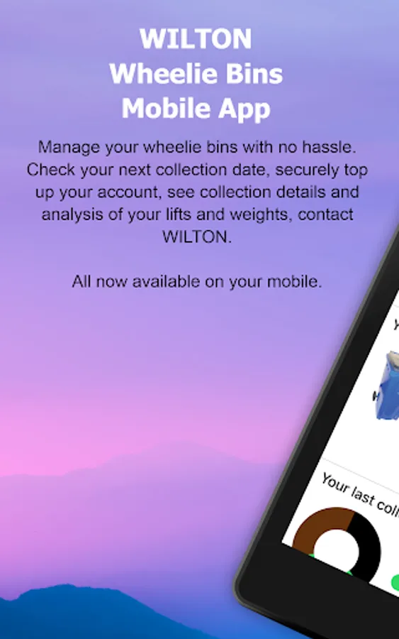 Wilton Wheelie Bin Customer App - Check you bin lifts, monitor the weights of your bins, see on the graph how well you recycle, view your account balance, check you next bin collection. Pay your bill or Top Up your Wheelie Bin Account online from your App. If you don't remember your PIN, you can retrieve it by providing your registered mobile number, we will text it to your mobile