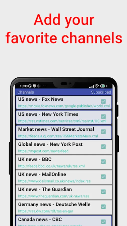 - Personalize by add and subscribe to global *RSS news and / or local news channels of your choice.