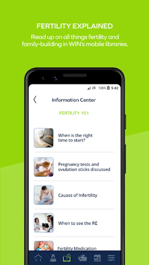 Now with your smartphone, you can access key fertility information, set reminders for important events, track your period and predict your most fertile days, input your personal symptoms and share with a WINFertility network physician or whomever you want, all in one discreet place - any time of the day. Plus, as a bonus for members or employees who have fertility benefits that are managed through WIN, have one-touch access to custom content and 24/7 availability of experienced clinicians.