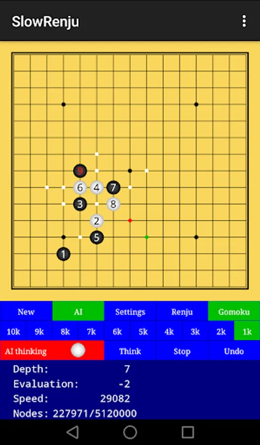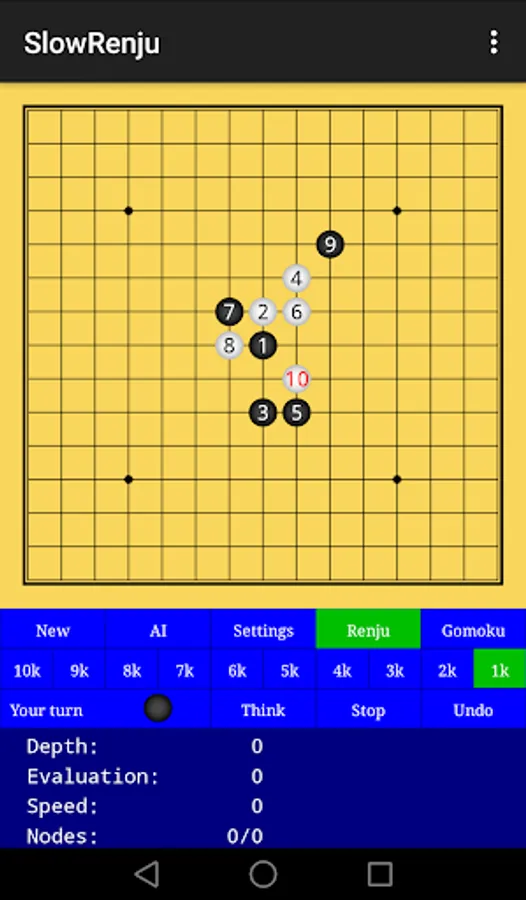 SlowRenju is a competitive artificial intelligence which can play Gomoku and Renju. This is an Android application for it. Here you could play Gomoku and Renju with computers in different levels or with yourself in your mobile device. You could also analysis the status of the board with the AI inside this program.