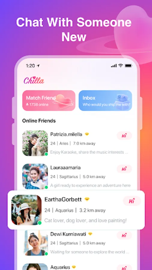 Whether you're looking to meet new friends or chat casually, Chilla is committed to providing the most relaxing and enjoyable chatting experience. With millions of users online 24/7, it's easy to find like-minded people efficiently and start chatting and building relationships for free anytime!