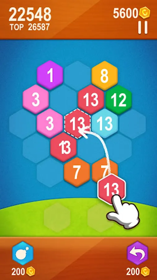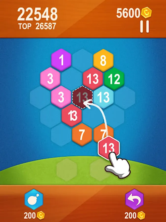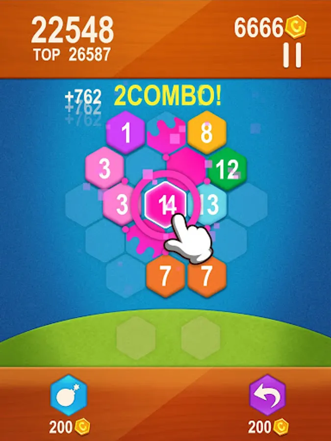 In the game, you make three or more same numbers merged to a higher number. The goal is to make the number 14 with Hexa blocks! Combo merges could give you extra points.