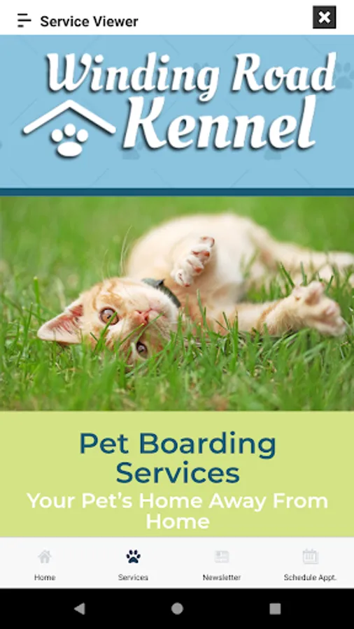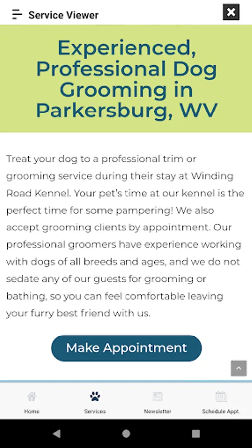 Winding Road Kennel in Parkersburg, WV opened in 1993 with the goal of providing a safe, comfortable, resort-like haven for beloved companion animals. We provide each of our guests with superior care and human companionship while their families are away. Every member of our staff loves animals, and we take care of your pet as if they were our own while they stay with us. Use our mobile app to schedule boarding & grooming services in advance.