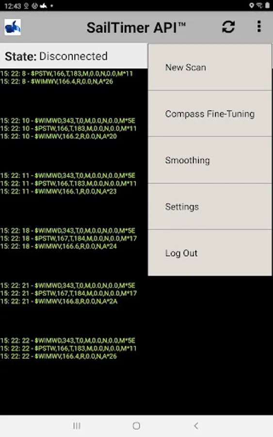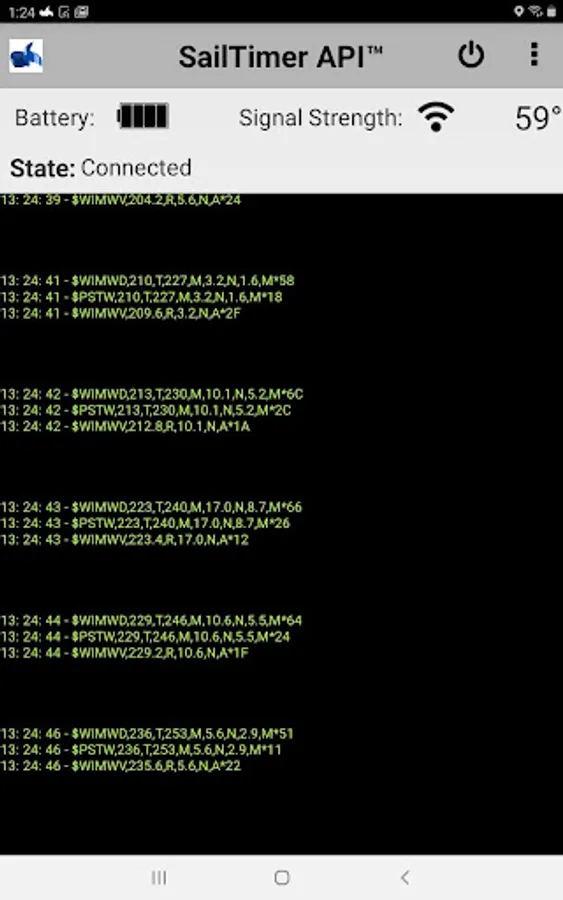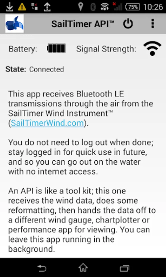 Use this API with the SailTimer Wind Gauge™ app or with other navigation, wind gauge or performance apps that support the SailTimer Wind Instrument™ (www.SailTimerWind.com/OtherApps.html). The GPS in your device needs to detect some change in your location before data starts to be sent, which may take a minute or two. The API sends official NMEA 0183 sentences for wind direction (MWD) and wind angle (MWV) to other apps for viewing.