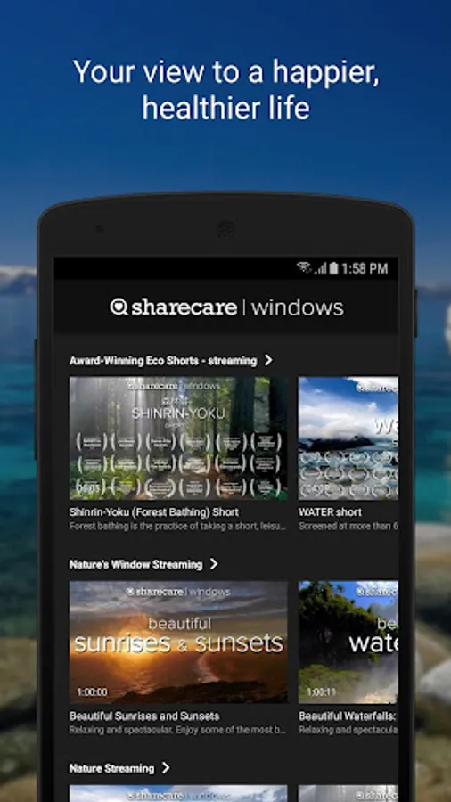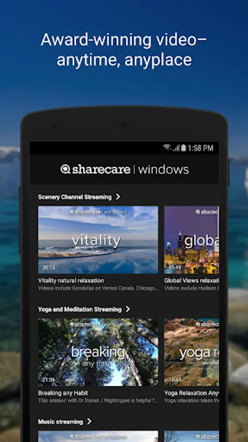 The world’s best travel destinations, hotels, cruise lines and healthcare providers have relied on Sharecare Windows’ original relaxation and inspirational video to enhance the viewers environment and provide an all-encompassing digital media environment. Sharecare Window’s video library includes 400 hours of original programming for relaxation, sleep, yoga and background imagery enjoyed by more than 300,000 viewers each month worldwide.