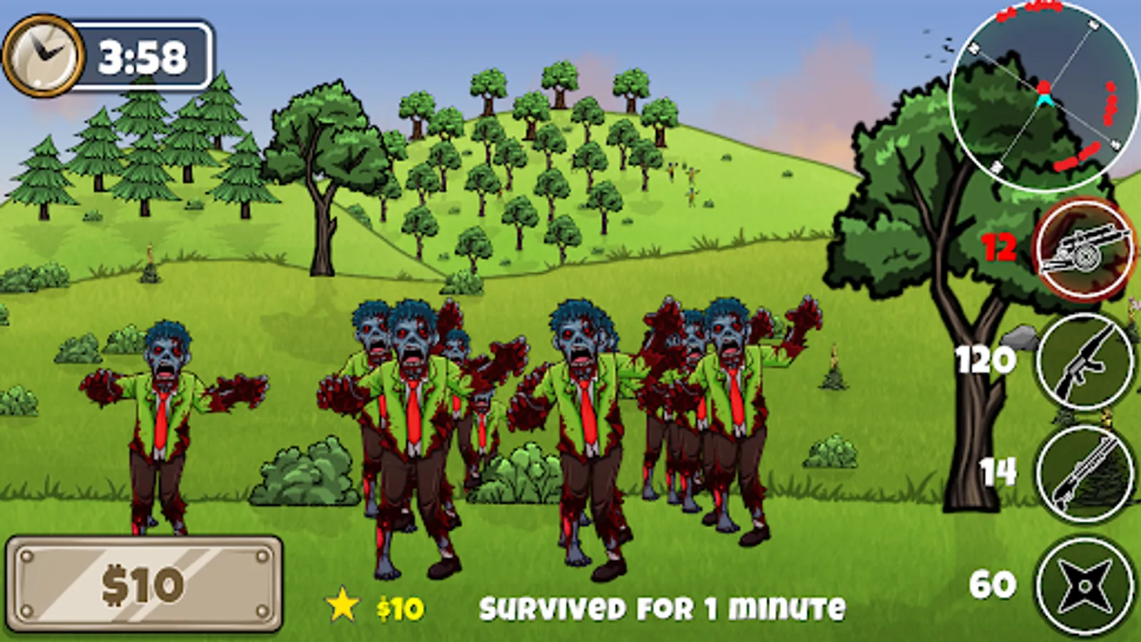 Survive waves of zombies - and it's not just zombies, it's zombie dogs, trolls, frogs and spiders too! Work your way through the levels on your survival map, and buy extra more powerful weapons with the money you earn.