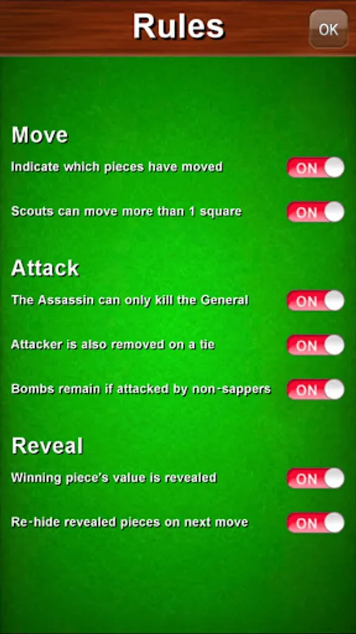 You can play with the standard rules or change any of the various rule options to suit your play. The Artificial Intelligence of the various computer controlled opponents is very strong so you'll have to fight deviously to win!