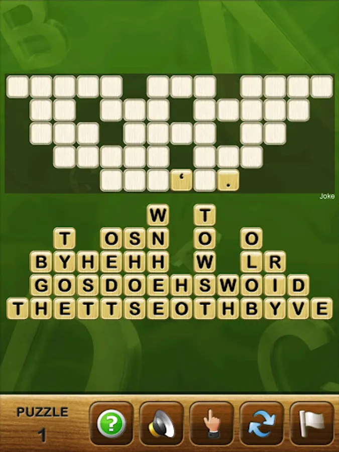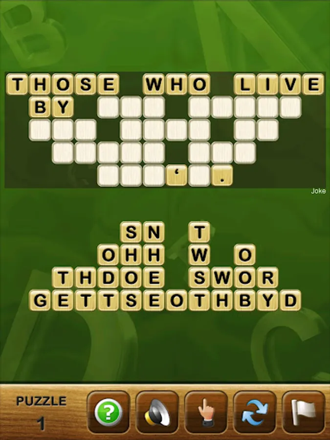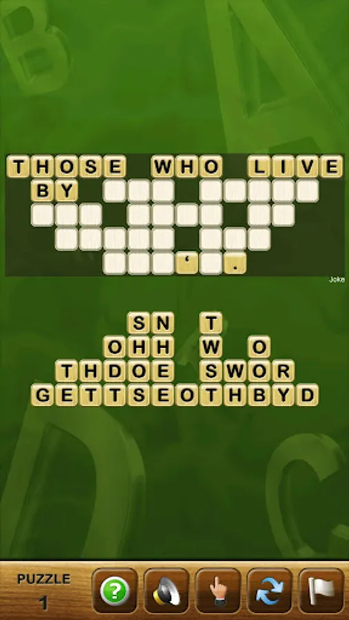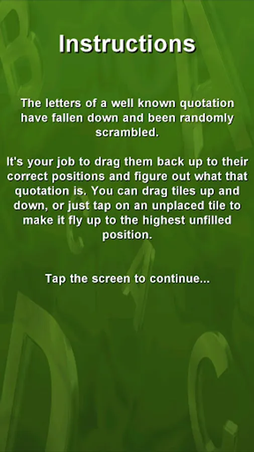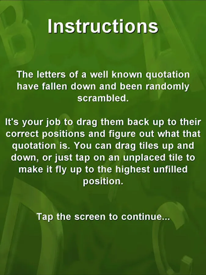 The letters of a well known quotation have fallen down and been randomly scrambled. Your task is to drag them back up to their correct positions and figure out what that quotation is. You can drag tiles up and down, or just tap on an unplaced tile to make it fly up to the highest unfilled position.
