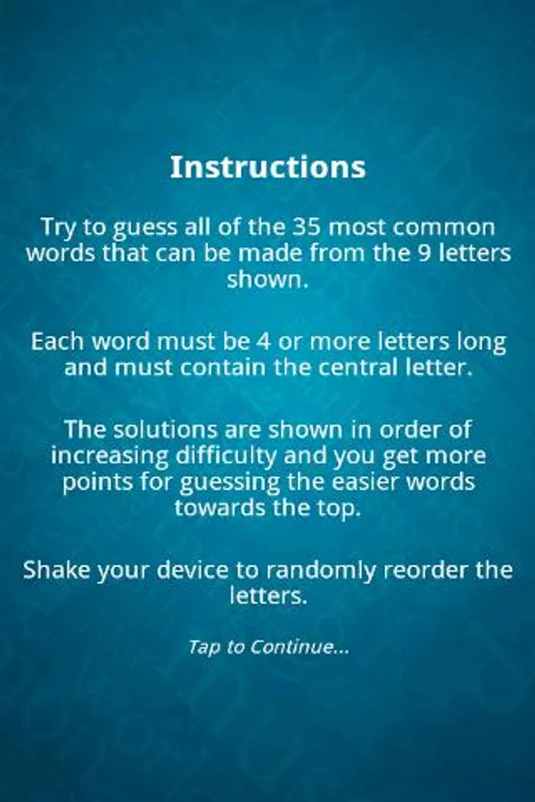 The objective of the game is to try to guess all of the 35 most common words that can be made from the 9 letters shown. Each word must be 4 or more letters long and must contain the central letter.