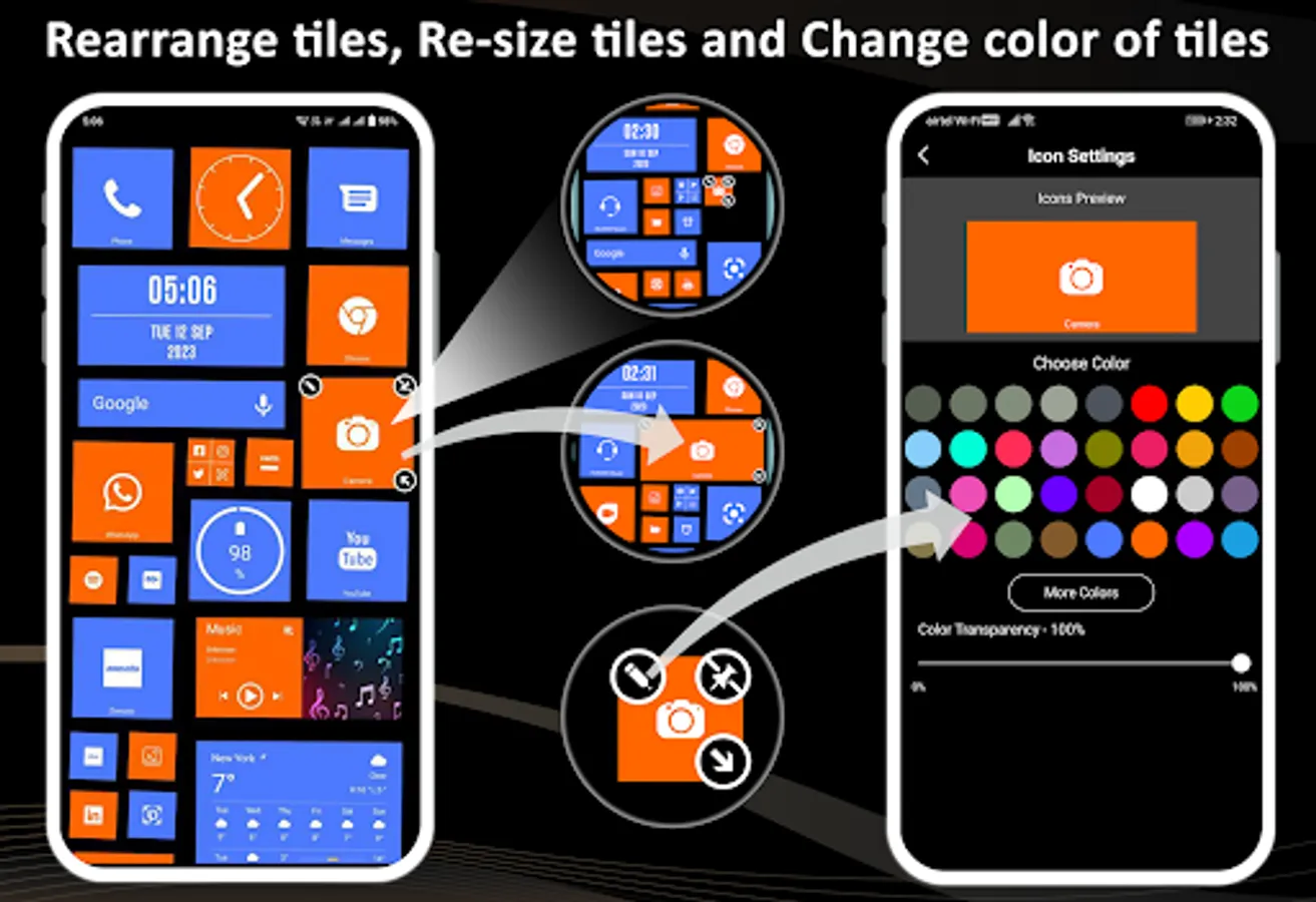 Stand out from the crowd by personalizing your tiles. Change background colors to match your mood or make them transparent to showcase your wallpaper. Choose between system default icons or third-party icon packs to express your unique style. By making tiles transparent you get glassy win style look on your phone.