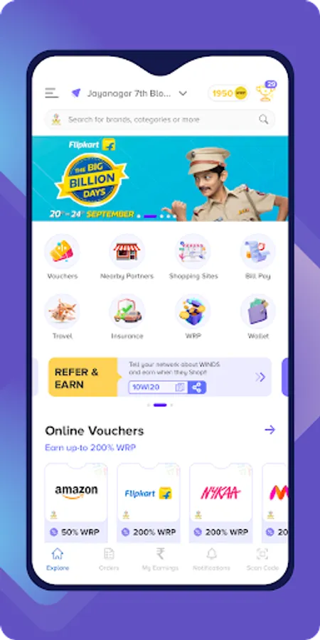 WINDS App is a one-stop solution shopping & payments app that offers the best online & offline shopping experience via an opportunity to win cashbacks* via Spin Wheel on every transaction. Whether paying your monthly utility bill payments online (electricity bills, water bills, gas bills, broadband bills), buying brand vouchers/e-gift cards for your favourite brands (Swiggy, Myntra, Flipkart, Amazon, Zomato, etc.), making payments at your nearby offline stores or shopping at your go-to online shopping sites (Nykaa, Ajio, Myntra, Boat, Samsung etc.), we have got you covered!