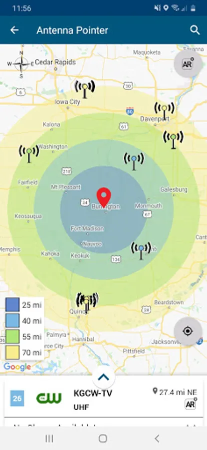 - Antenna Pointer - Use the top-down map view to locate all HDTV TV towers closest to your address or GPS location. Eliminate signal obstructions such as trees, hills, and buildings by switching to the AR view. Simply point your phone to the horizon and rotate 360 degrees to bring into view your desired TV tower and find the best location to point your antenna. The number displayed above a tower indicates the number of channels available. Tap the tower icon to see full channel details.