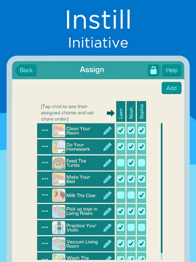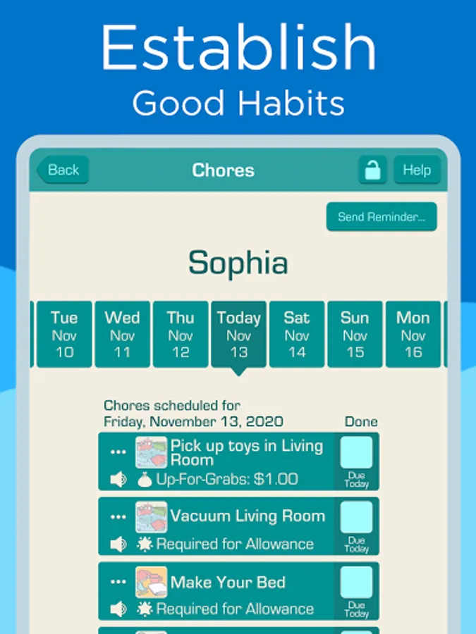 Kids can watch their allowance savings grow with the allowance Graph and see how much savings they'll have in the future. Kids can see what chores need to be done and check them off when completed. Kids can receive chore reminders without having to open the app.
