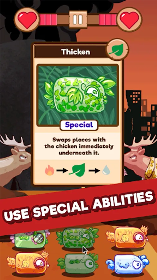Cluck Cluck Moose takes place in a world where humanity is extinct and moose mobilize their chicken armies to rise to the top. Guide these moose on their journeys to stack, swap, and clash their chickens until no more moose stand in your way. As you progress, the enemy moose will become more and more dangerous, so you will have to keep your wits about you to avoid being a victim of “fowl” play.