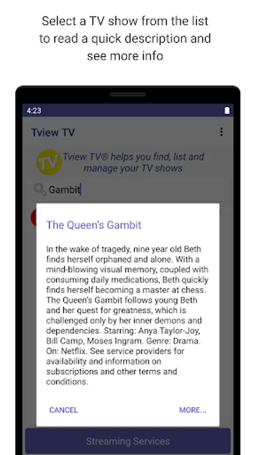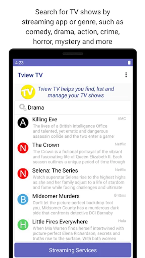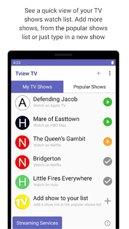 Tview TV helps you find TV shows, TV series, streaming apps, create watch lists. Tview TV has loads of TV show and TV series suggestions. Search Tview TV's Popular TV Shows listing for series to watch, you can search by streaming app, show name - read TV show descriptions, see streaming app options and more.