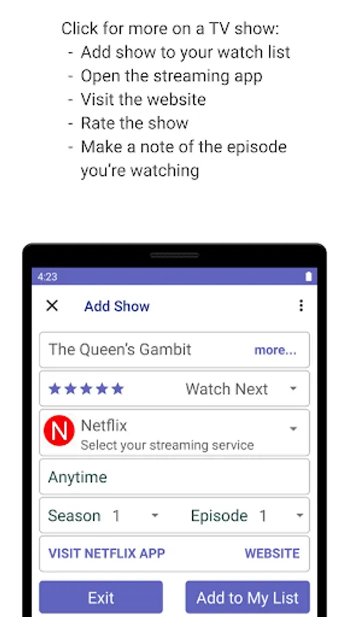Add TV shows to your watch list, categorize the ones you're watching now, want to watch next, etc. You can enter show information about the streaming service, when it's on, rate shows or add comments (for your enjoyment). You can also click to visit the streaming service providers' website to read more about TV shows you're interested in.