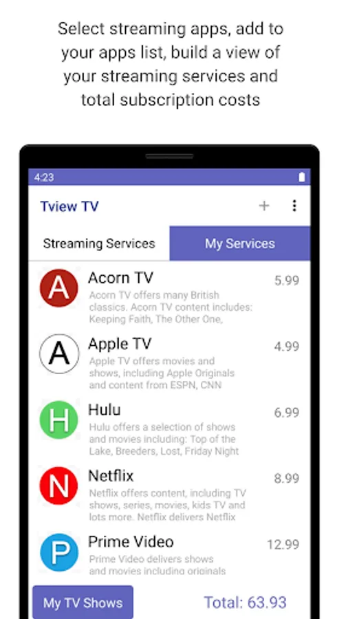 Search through Tview TV's list of streaming services to see which ones you currently use and add them to your list. If you subscribe to a streaming service, add the subscription you pay and Tview TV will total of how much you're paying every month (we think it will surprise you!).