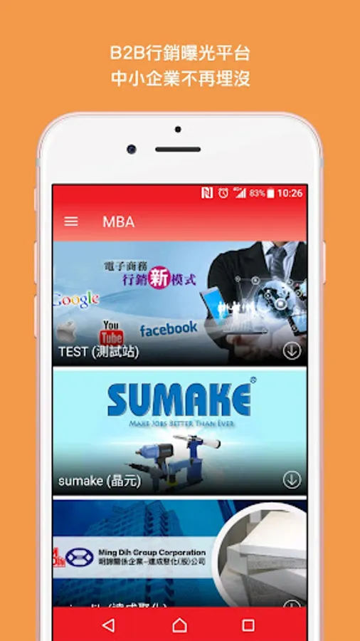 MBA (Mobile Business Application) is a platform of integrates B2B vendors of information integration, such as Manufacturing, Business, Distributors, Exporter, Trader, Commerce, OEM, ODM, Seek Agents, Maker…etc, help your vendor APP integration in the MBA, instantly download, let the MBA become your exclusive action Business Broker.