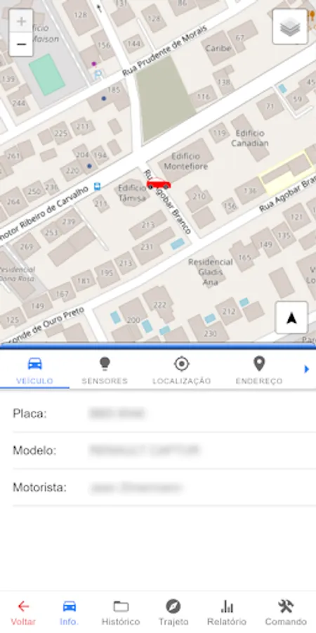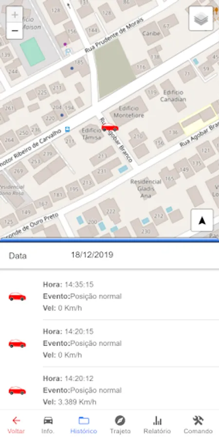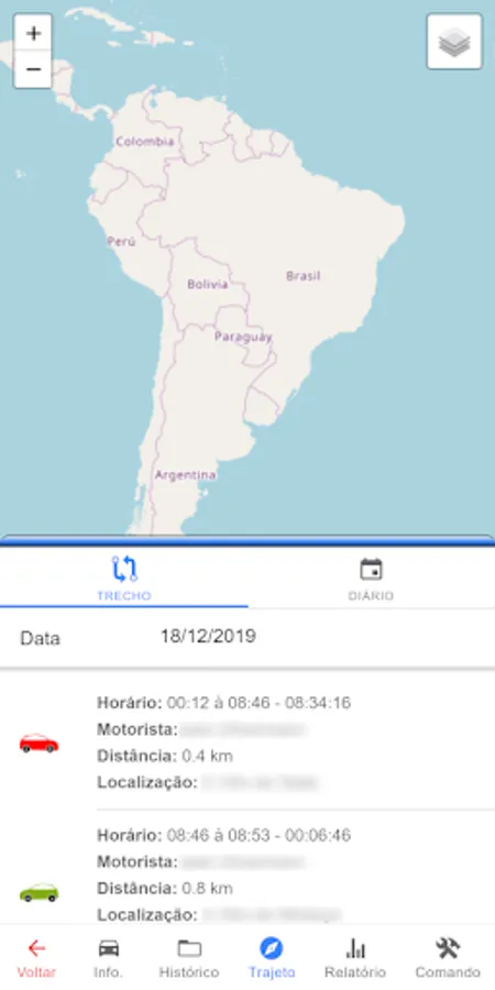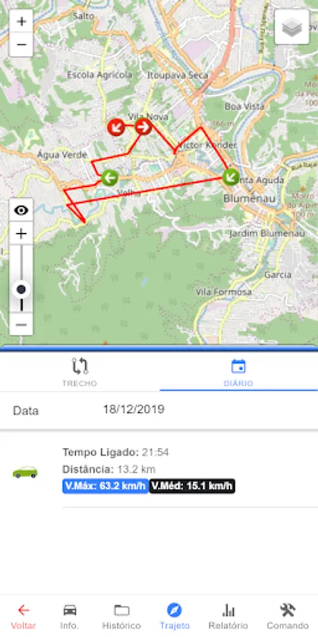 Lists the sections traveled by the vehicle on the selected date, bringing in the section tab the distance traveled, maximum and average speed, location and elapsed time. The daily tab brings the data grouped from these sections by the selected date.