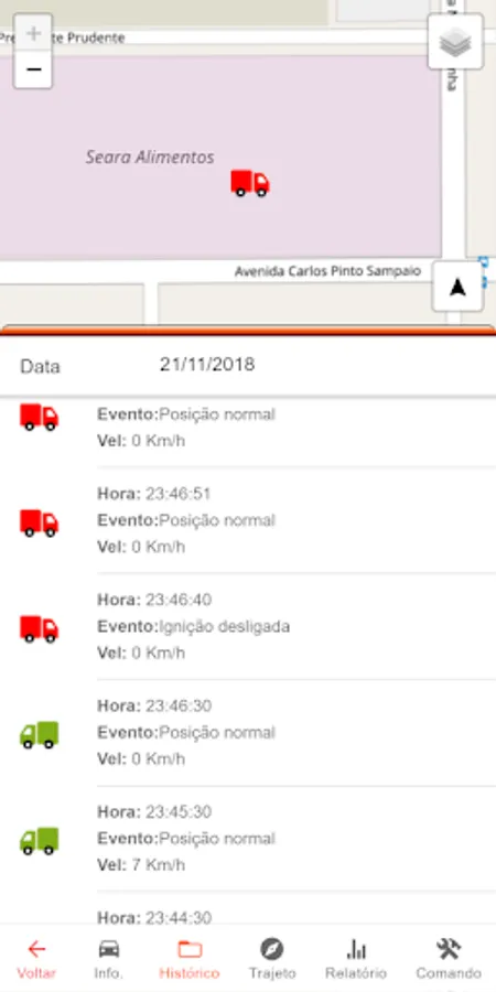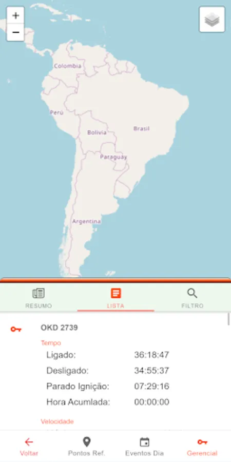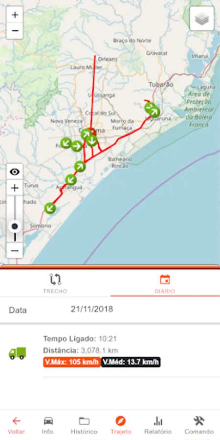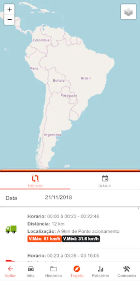 Lists the sections traveled by the vehicle on the selected date, bringing in the tab tab the distance traveled, maximum and average speed, location and elapsed time. The daily tab brings the data grouped from these snippets by the selected date.
