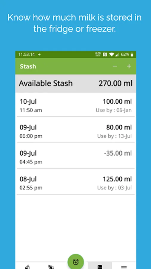 The Pumping or Stash tabs allows exclusive pumping moms the ability to track how much milk is being pumped and where it is stored.