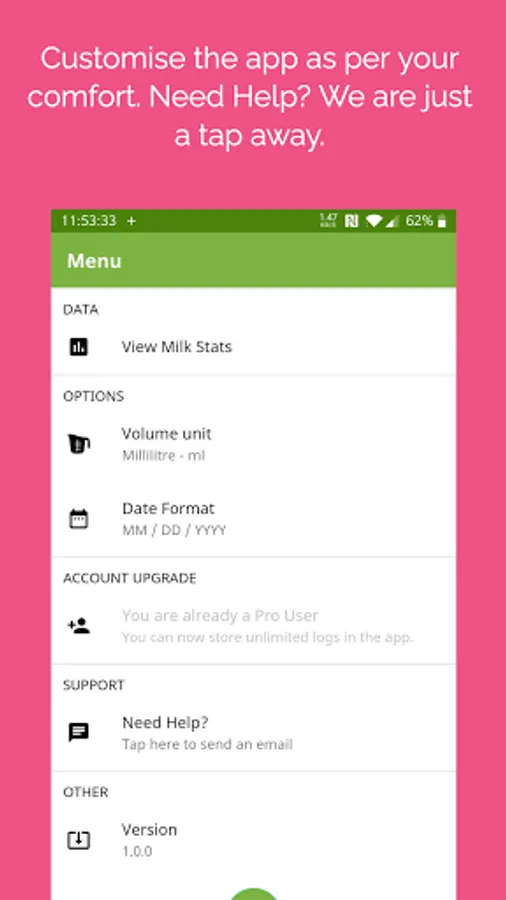 You could switch the measurement metrics between millilitres or ounces and also change the date format as you prefer.