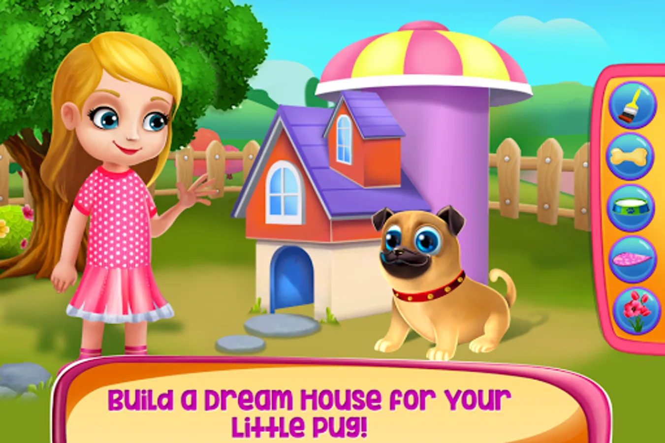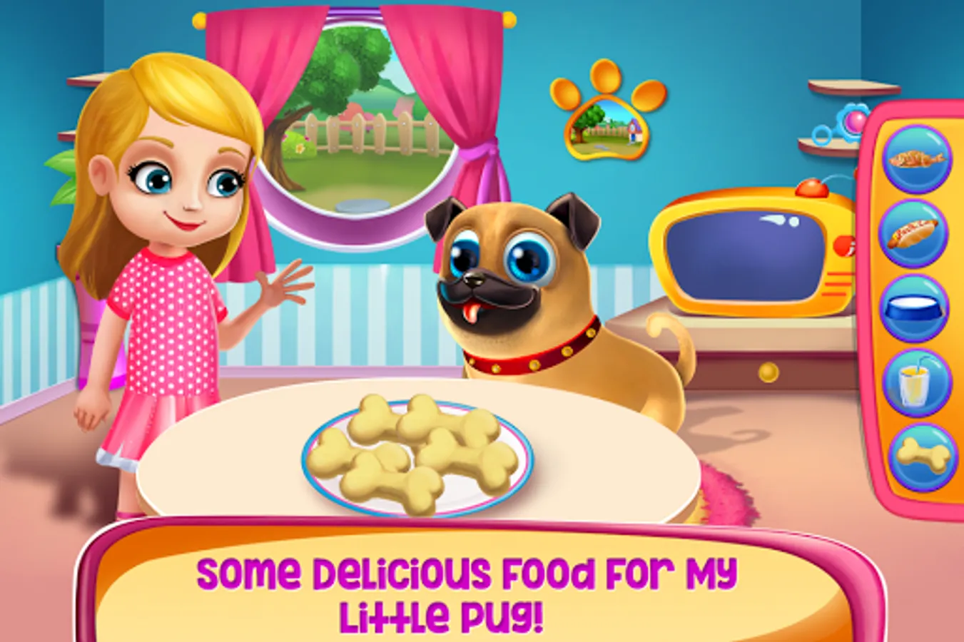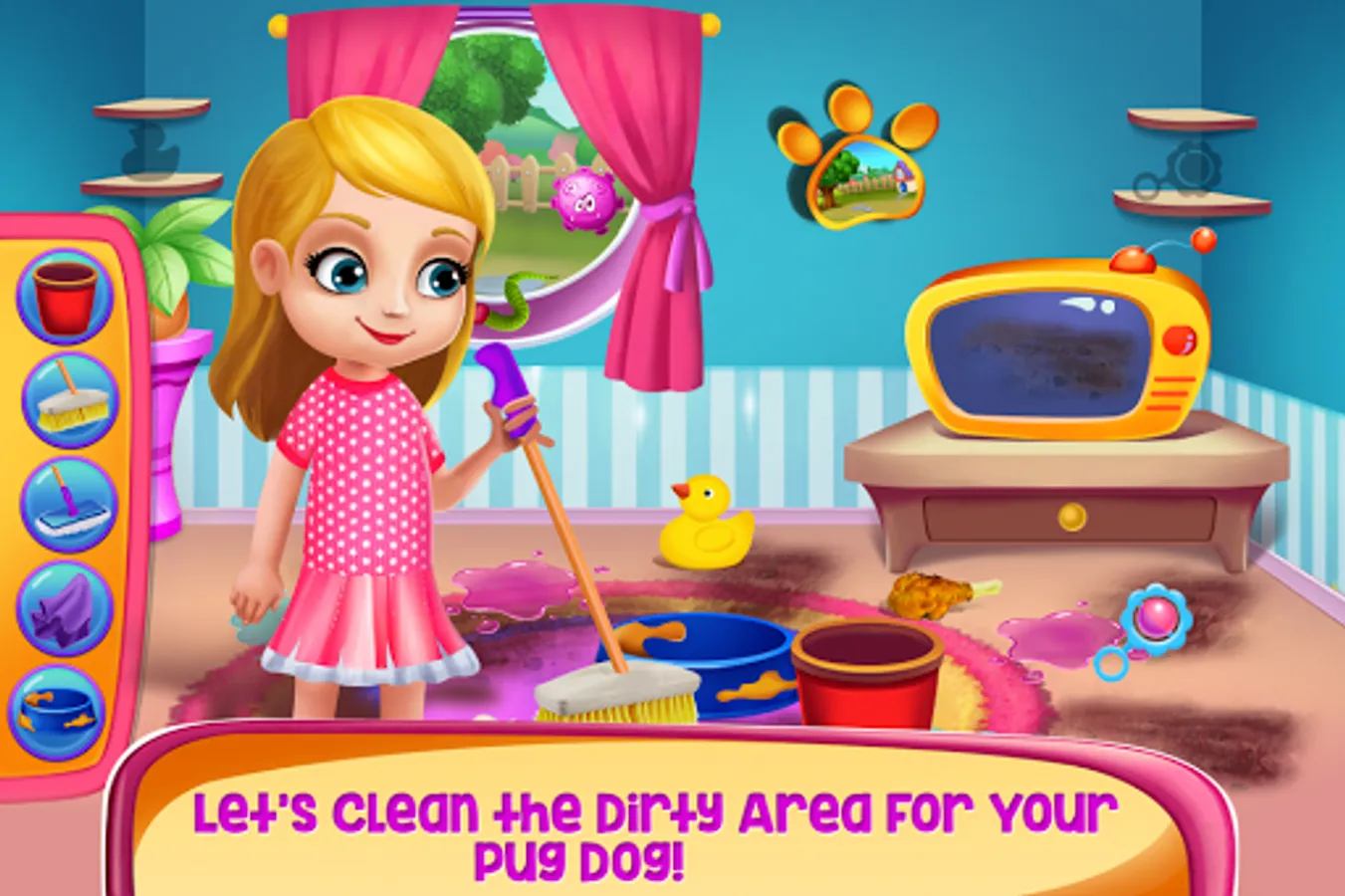 Check out this dog game and look at this adorable pug that needs a little grooming. Begin your adventure with the cleaning part of the game. Here you will make a proper environment for a home. Swipe the dirt, throw away the leftovers into the bin and remove any stains that might be spread on the floor. Arrange the misplaced objects and wash the TV. After all the cleaning you will give him a bubble bath and you will make sure that dirty fur is cleaned. Wash each part of the body with suitable products, like soap for the body and shampoo for the hair. Continue your care with the feeding part. Here you will have diversified food and a hungry little dog. Ensure his needs and offer the food he asks for, even if is milk or some biscuits, or a hotdog and a fish. Now that he regained his energy from eating, he will be ready to jump in the playground. Use all toys and try to have fun while you two are playing together. Go on the slide, play with a ball, maybe have a bump on the other playing devices. Keep playing and add an artistic part where you will rebuild his home together. Paint it, add some nice smelling flowers, a mat and personalize it with the bowl of milk and biscuits. Once he is full and tired of playing you will move along to the dress up. Create a unique aspect to suit the pug and make sure you use your creativity and style to do it. Put on funky accessories and try new things that would make him look like a happy dog that he is. Have a great time and don't forget to go a little crazy sometimes!