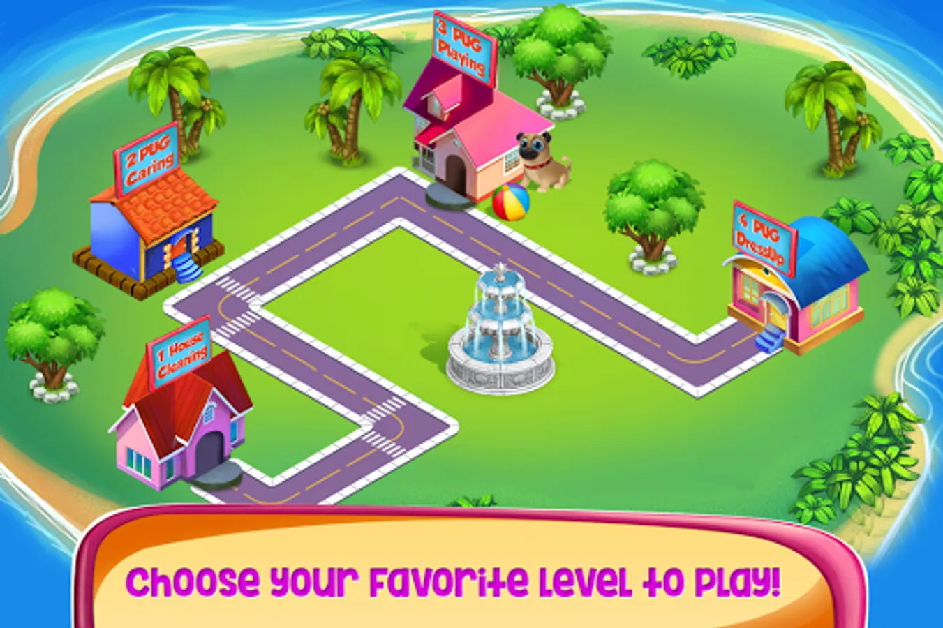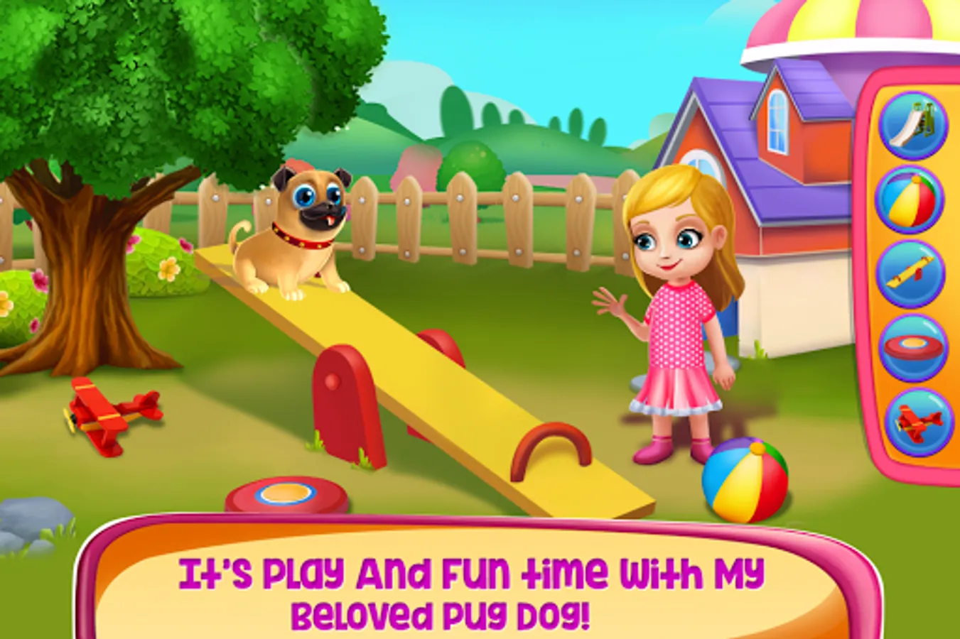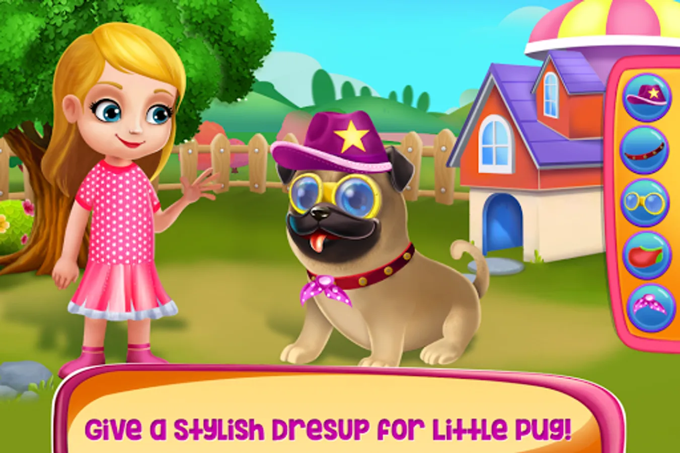 Check out this dog game and look at this adorable pug that needs a little grooming. Begin your adventure with the cleaning part of the game. Here you will make a proper environment for a home. Swipe the dirt, throw away the leftovers into the bin and remove any stains that might be spread on the floor. Arrange the misplaced objects and wash the TV. After all the cleaning you will give him a bubble bath and you will make sure that dirty fur is cleaned. Wash each part of the body with suitable products, like soap for the body and shampoo for the hair. Continue your care with the feeding part. Here you will have diversified food and a hungry little dog. Ensure his needs and offer the food he asks for, even if is milk or some biscuits, or a hotdog and a fish. Now that he regained his energy from eating, he will be ready to jump in the playground. Use all toys and try to have fun while you two are playing together. Go on the slide, play with a ball, maybe have a bump on the other playing devices. Keep playing and add an artistic part where you will rebuild his home together. Paint it, add some nice smelling flowers, a mat and personalize it with the bowl of milk and biscuits. Once he is full and tired of playing you will move along to the dress up. Create a unique aspect to suit the pug and make sure you use your creativity and style to do it. Put on funky accessories and try new things that would make him look like a happy dog that he is. Have a great time and don't forget to go a little crazy sometimes!