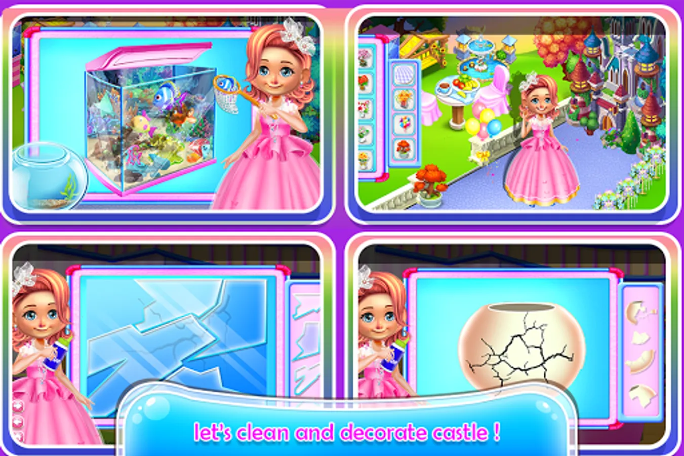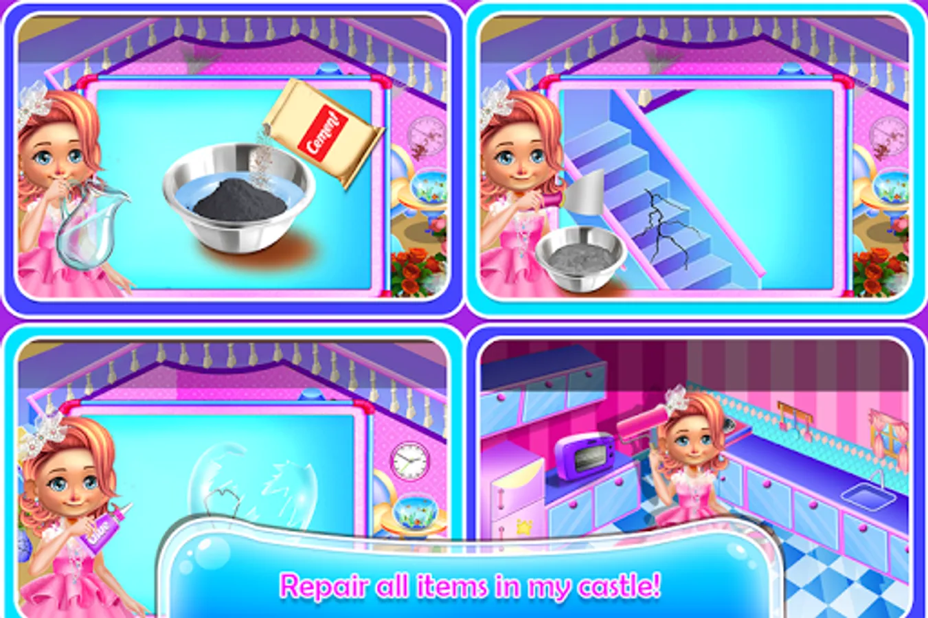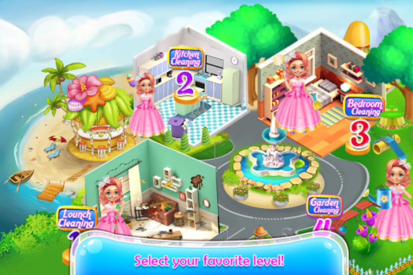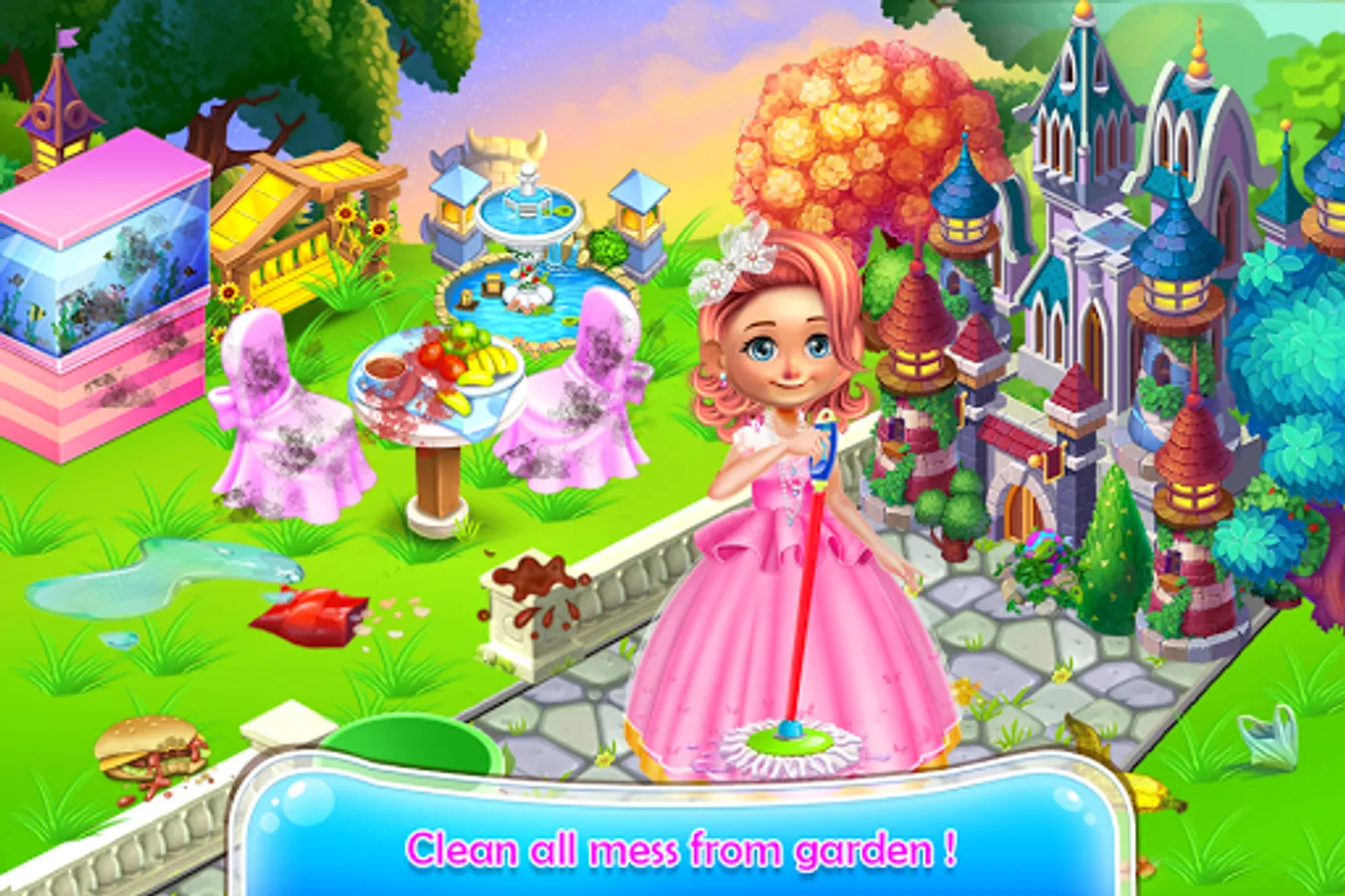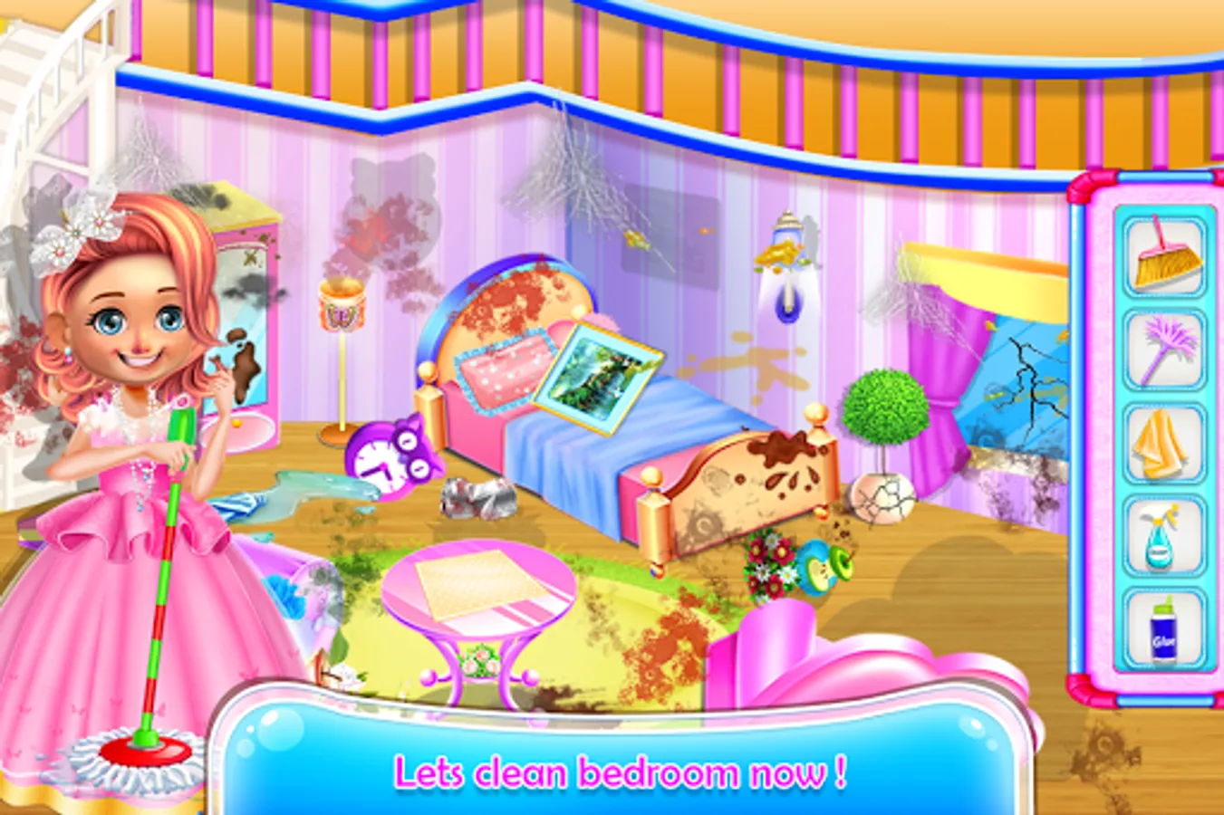 Let's clean up this mess together! Spend a lovely time in this cleaning game where you get to help a beautiful princess to restore her home and make it look like new again. Before you begin your washing session you must know that there are multiple challenges coming. You will clean, restore and decorate in different environments and each room has its issues, so be prepared to overcome any obstacles. Start the cleaning in the living room area, then continue with the kitchen, the bedroom, and the exterior garden. You will remove the garbage, get rid of the dust and the stains on the floor. Right after you will decorate this room. Next comes the eating room. Here you will clean the floors, remove the stains, throw the garbage and then get rid of those stinky leftovers that are spread all over the kitchen. Replace the rotten food from the fridge and clean it, then wash the dishes. The main bedroom must be restored too. Use the given devices to clean the area and try to fix anything that might look deteriorated. Add some style with new furniture or decorating items. Continue the challenge with the gardening part. Here you will clean the leaves from the ground and the fountains, remove the garbage and arrange the misplaced land. Go through similar steps and decorate the place right after you washed away the dirt and fixed the broken items. Complete the chores and help this princess to have a refreshed home with a brand new design in interior and exterior as well.