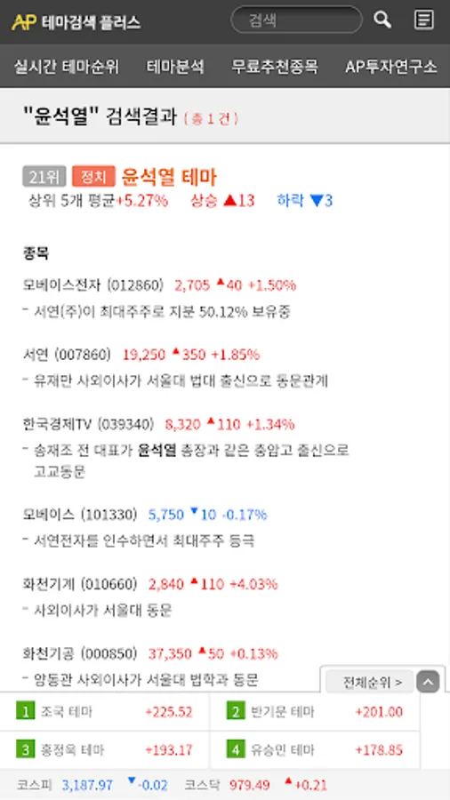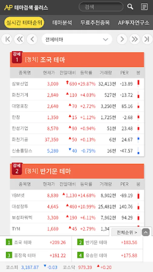 AP Theme Search Plus automatically selects a list of the theme mains moving in the market and shows the market-leading bullish themes in real time.