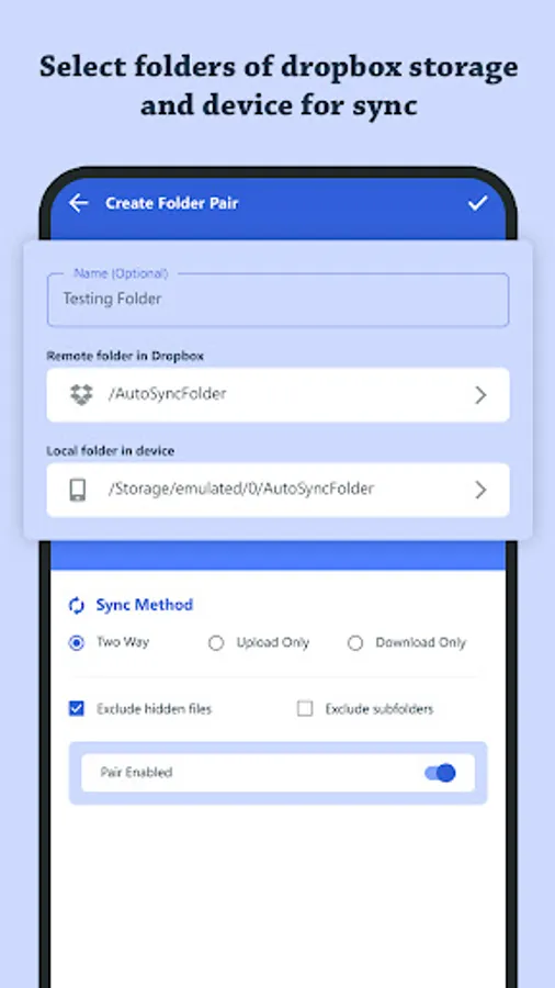 You just need select the Dropbox folder and local device folder for sync. You can also set your sync method – Two-way, Upload Only, and Download Only. You can also set sync file preference – exclude hidden files and exclude subfolders.