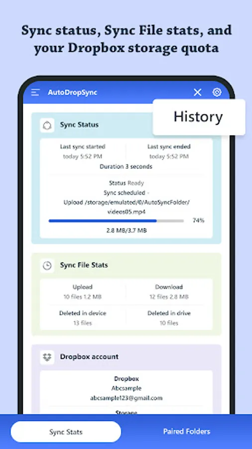 You can view last sync time and duration. You can also view next sync scheduled time. It also displays the progress for uploading and downloading files. Sync file stats shows you last sync total files - uploaded, downloaded, deleted in device, and deleted in Dropbox. It shows Dropbox storage details - quota, used and available size.