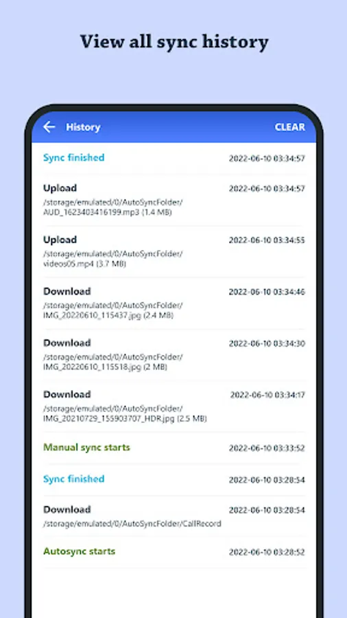 You can view all the sync history with time – uploaded files, downloaded files, or any errors occurred. You can clear the history.