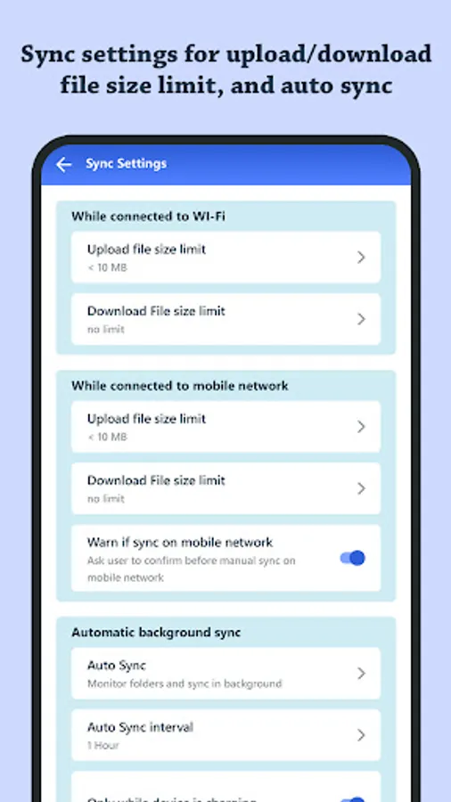 By enabling auto sync feature you can sync the data automatically after specified time interval. You can set the auto sync interval time. For auto sync, you can set the minimum battery level and preferred internet connection.